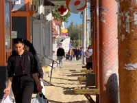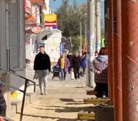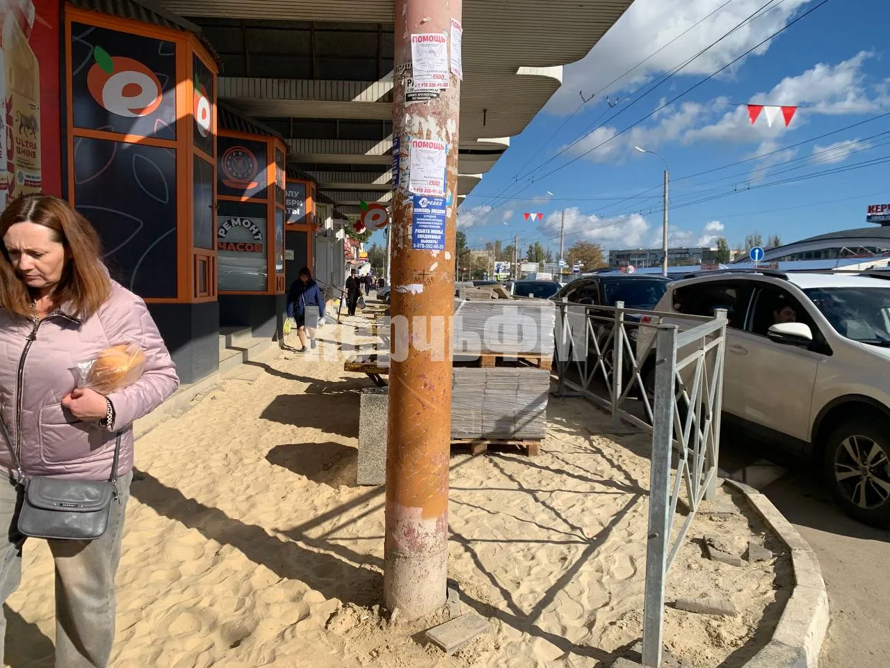 У торговых павильонов напротив центрального рынка по улице Еременко замена плитки на тротуаре близится к завершению.
