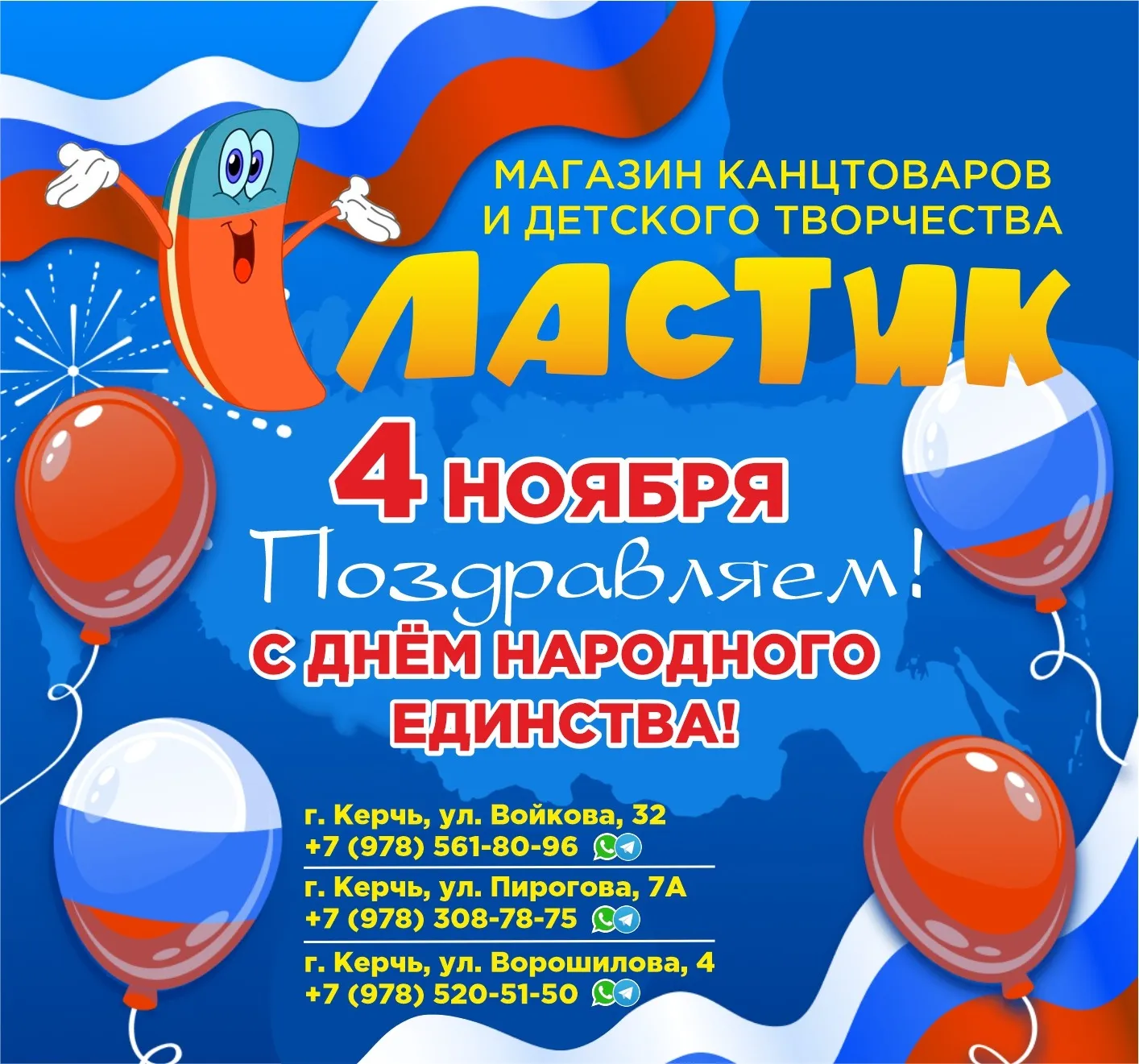 Магазин канцтоваров «Ластик» от всей души поздравляет Вас  с праздником, с Днем народного единства!