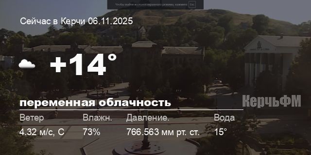 Сегодня днем в Керчи, 06 ноября, ожидается пасмурная погода, температура воздуха от +12.1° до +14°С, ветер северный 5.19 м/с, порывы до 5.62 м/с, давление 765.8 мм рт. ст., влажность 74%.