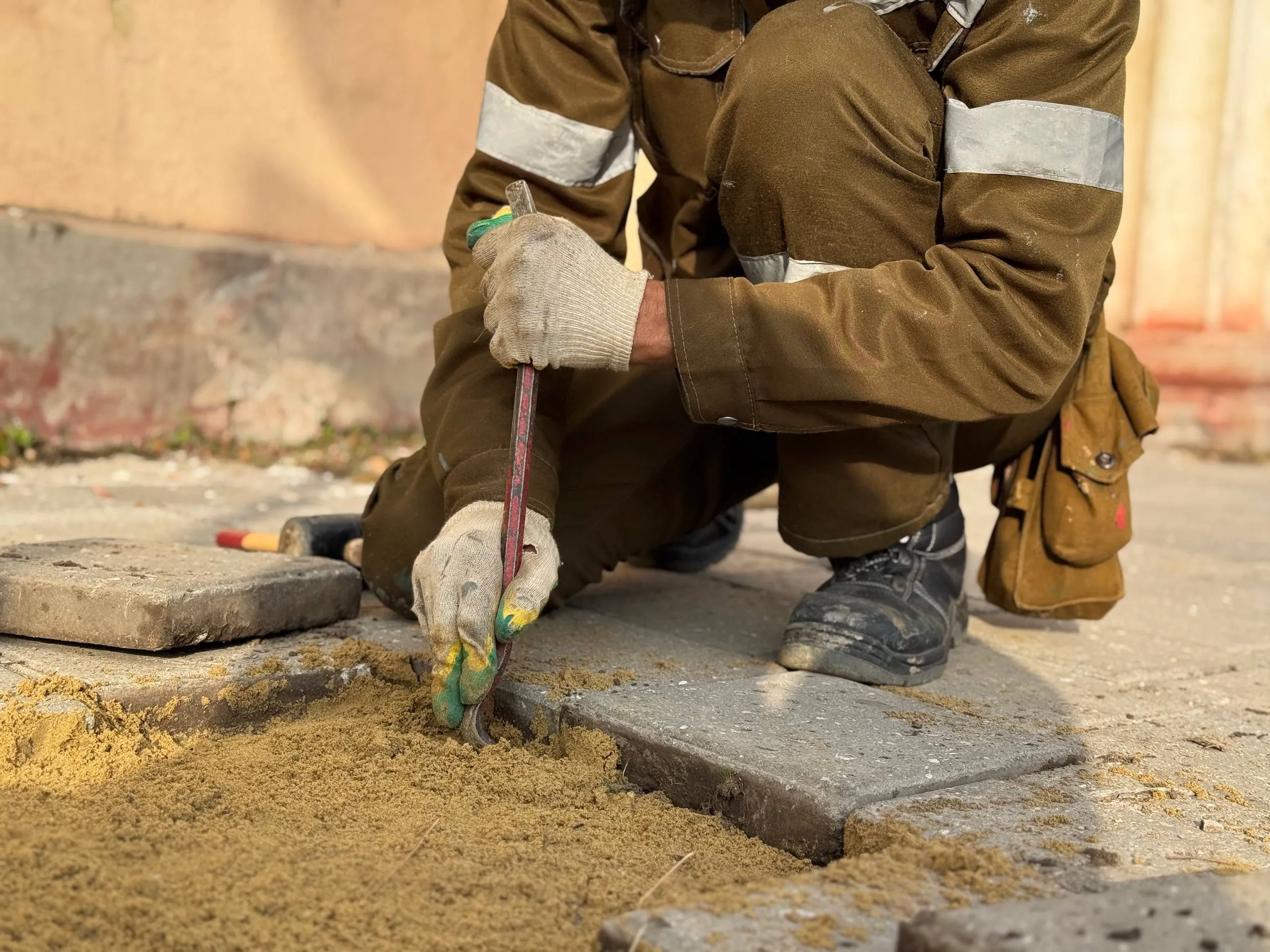 В местах отсутствия и проседания плитки рабочие выполняют подсыпку песком и его уплотнение, что необходимо для создания ровного основания под покрытие. Коммунальная служба выравнивает поверхность тротуаров, обеспечивая безопасность и удобство для пешеходов.