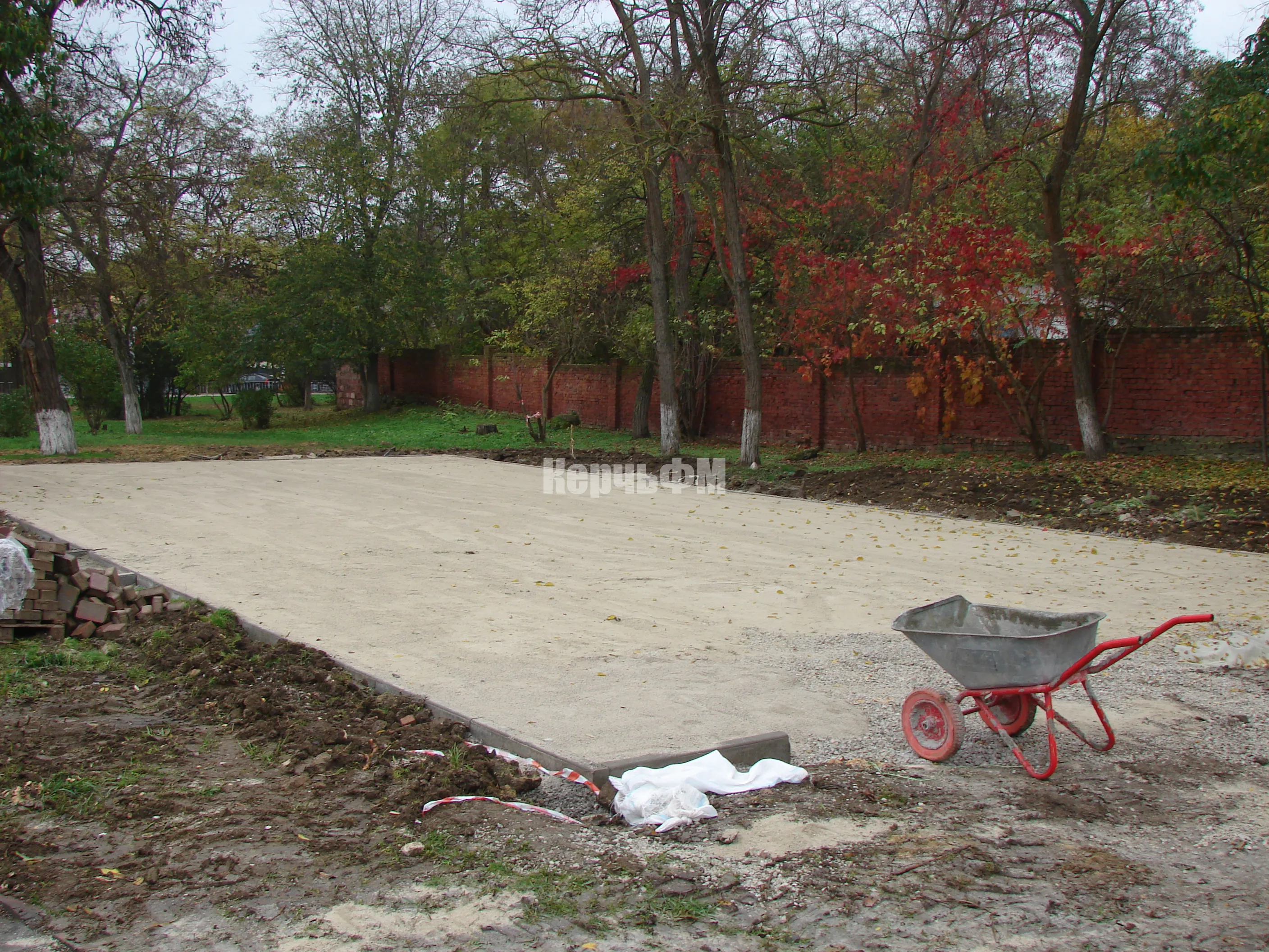 Территорию уже обнесли поребриками, уложили геотекстиль, чтобы предотвратить прорастание травы, отсыпали основание из щебня и приступили к трамбовке материала.