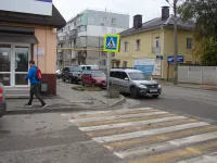 Весь обзор закрывают автомобили, припаркованные прямо у пешеходного перехода.