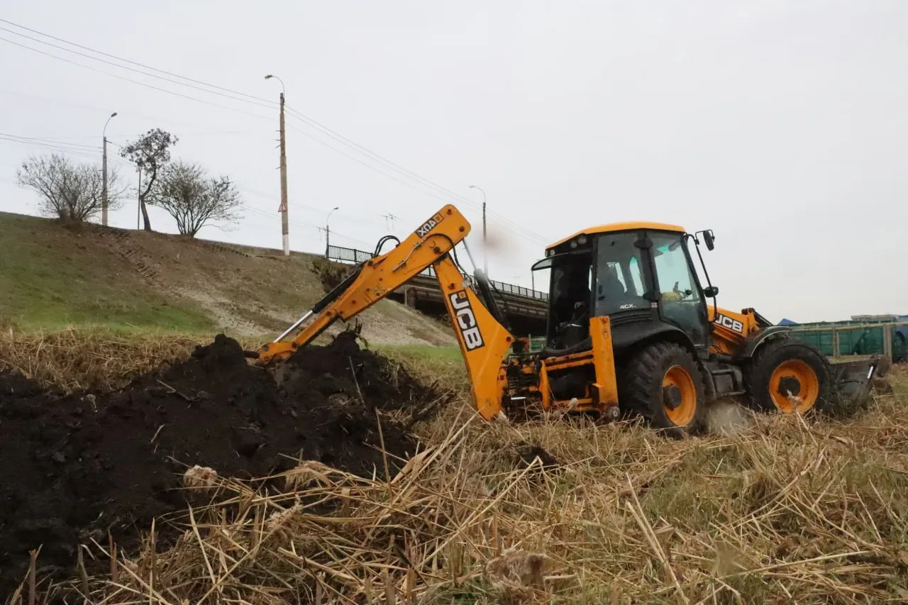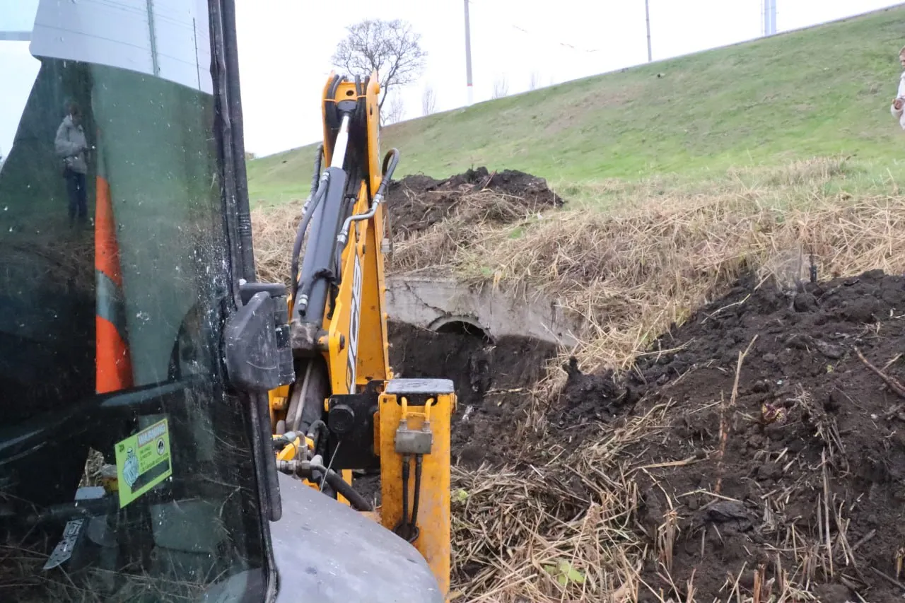 Сотрудники Службы городского хозяйства восстанавливают работоспособность системы отведения ливневых стоков в районе Горьковского моста.