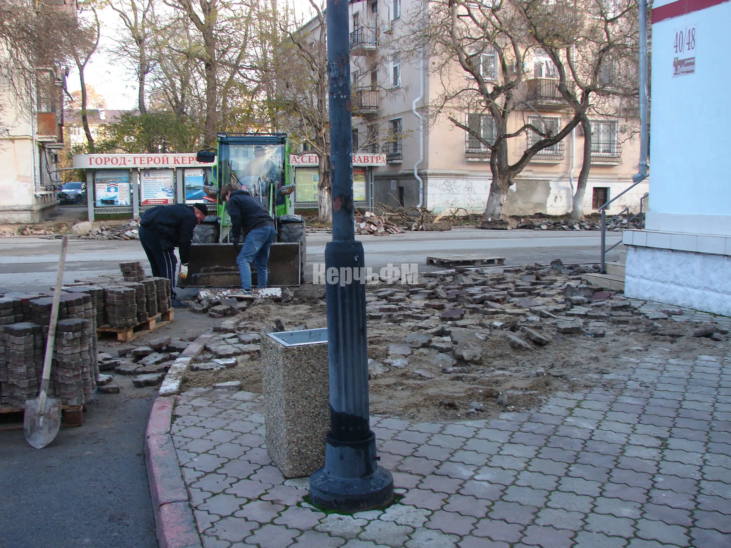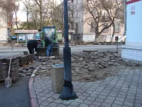 Выезд с Дубинина преграждает складированная тротуарная плитка. Продолжаются работы по обновлению тротуара.