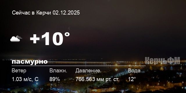 Сегодня днем в Керчи, 02 декабря, ожидается пасмурная погода, температура воздуха от +9.9° до +11°С, ветер 2.01 м/с, порывы до 3.9 м/с, давление 767.3 мм рт. ст., влажность 81%.