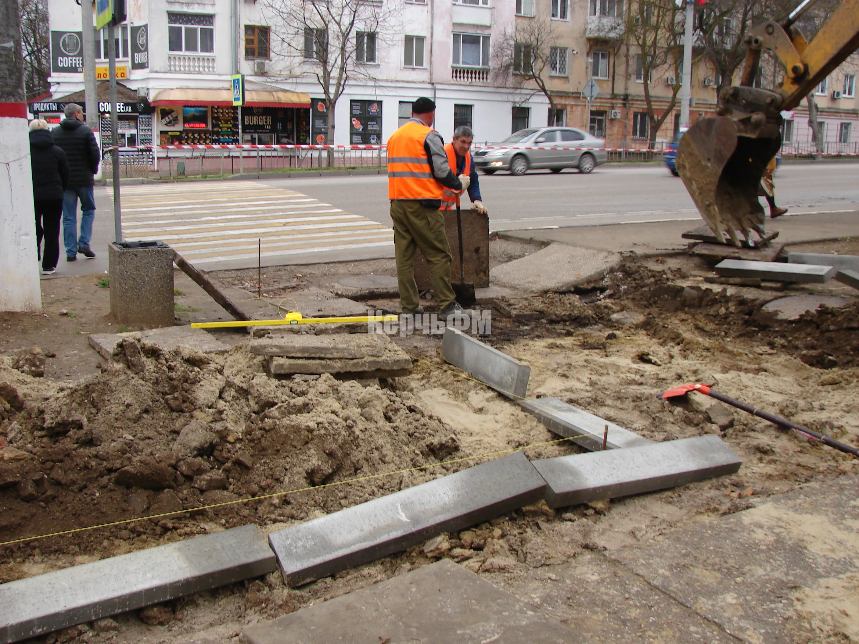 Ведется демонтаж старой плитки и готовится основание для капитального ремонта прохода к пешеходному переходу.