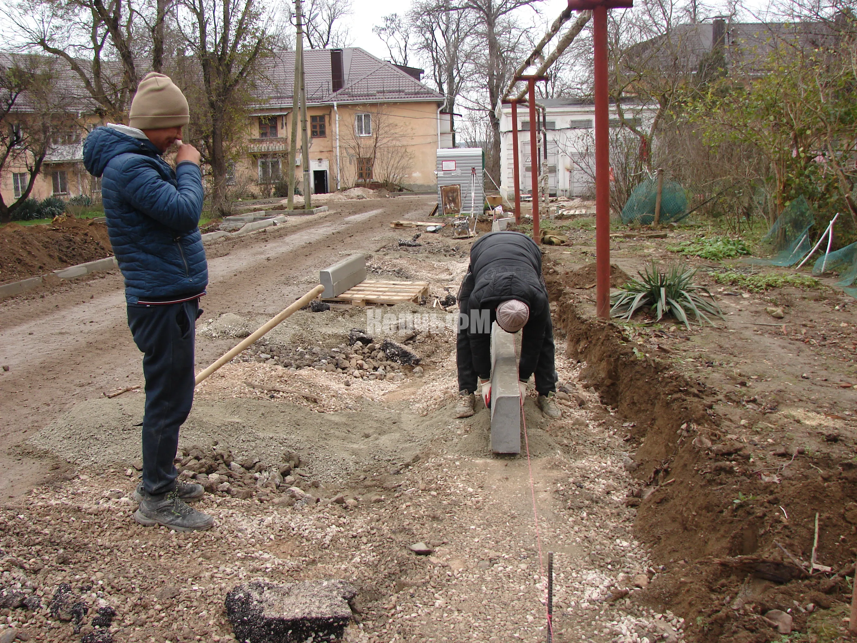 Ведется укладка бордюров вдоль внутриквартальных дорог и новых парковок.