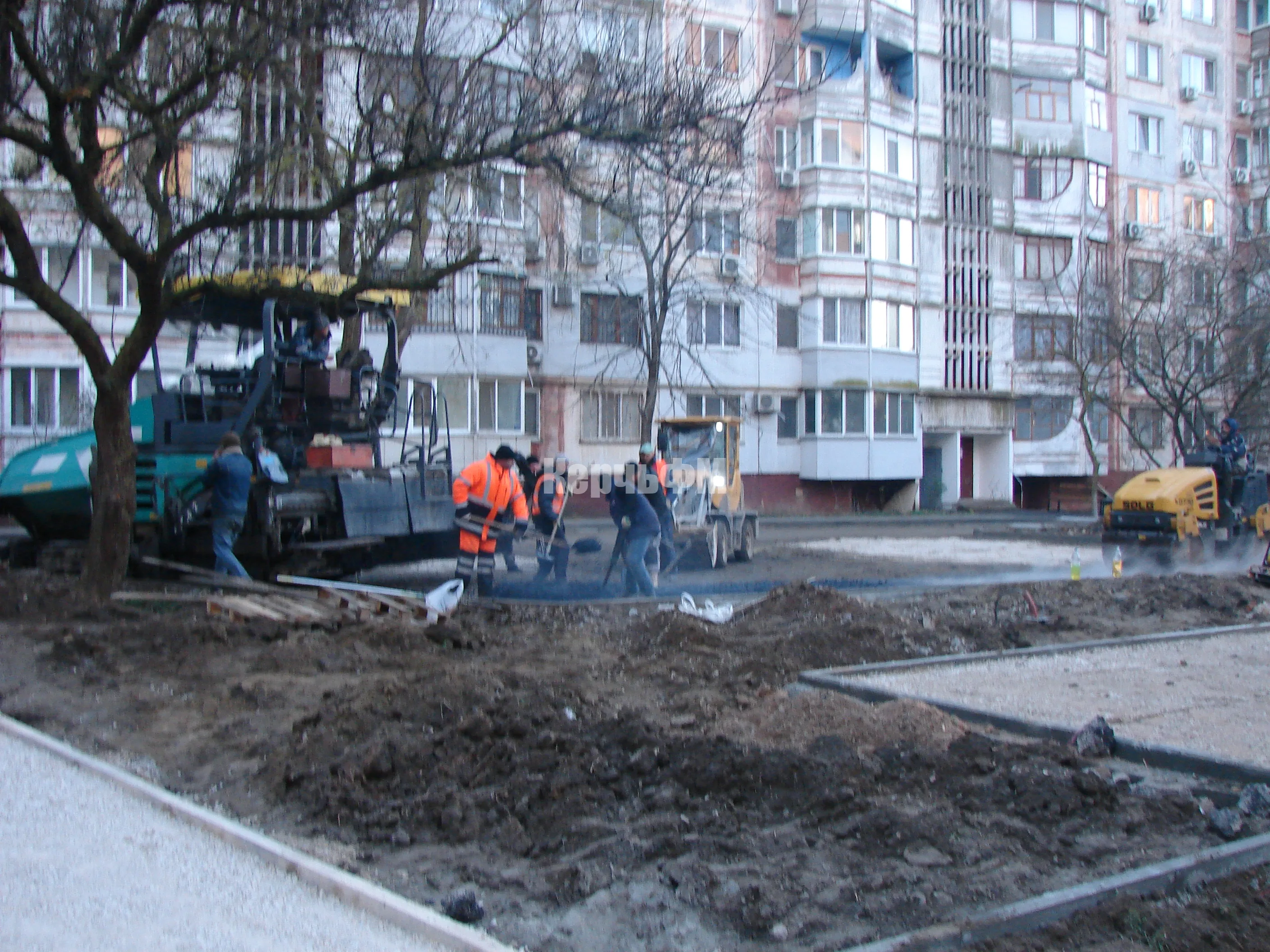 Продолжается укладка асфальта на бельевых площадках и подготовка новых тротуарных дорожек.
