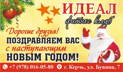 От всего сердца спортивный клуб "Идеал" поздравляет Вас с наступающим Новым годом! Пусть этот праздник принесет вам не только радость и веселье, но и заряд бодрости, новых сил и неиссякаемого энтузиазма для достижения самых амбициозных целей.