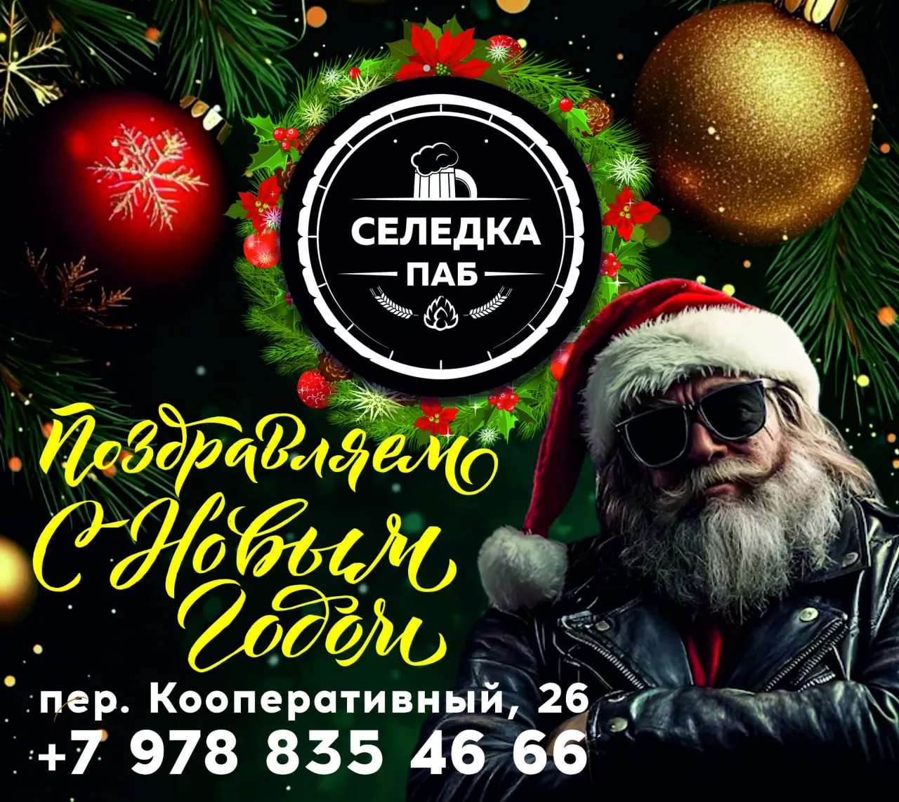 Паб "Селедка" от всей души поздравляет вас с наступающим Новым годом! Пусть этот волшебный праздник принесет в ваши дома радость, тепло и уют. Желаем вам крепкого здоровья, неиссякаемой энергии, исполнения самых заветных желаний и, конечно же, много счастливых моментов в кругу близких.