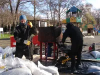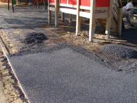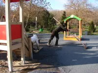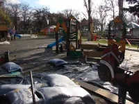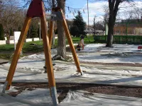 Сегодня на детских площадках ведется укладка нового резинового покрытия и, судя по приготовленным для этих целей материалам, работы еще много.