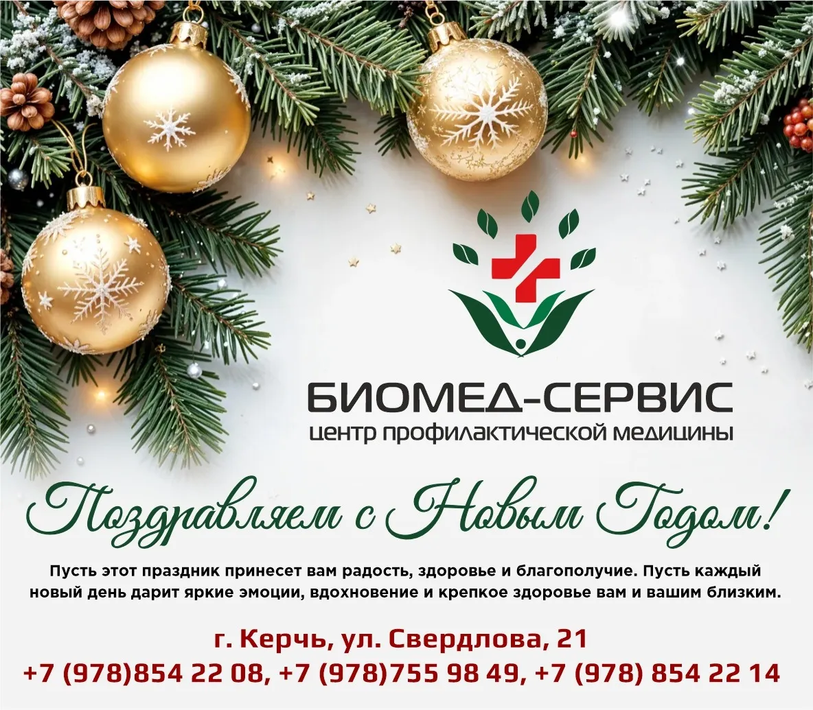 От всего сердца медицинский центр "Биомед-сервис" поздравляет вас с наступающим Новым годом! Пусть этот год принесет вам крепкое здоровье, неиссякаемую энергию и множество счастливых моментов.