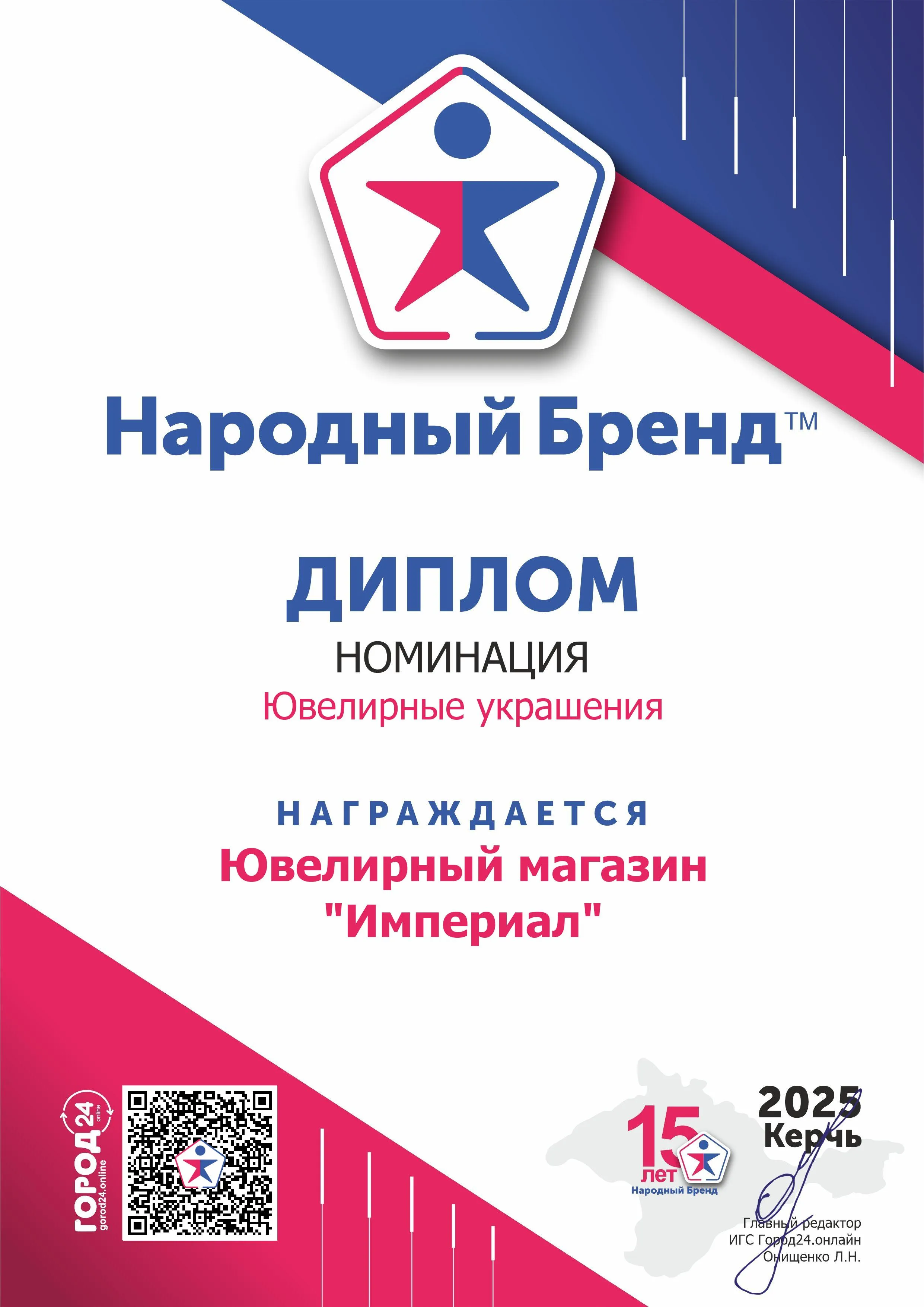 Победа в конкурсе «Народный бренд» - это знак искреннего доверия и благодарности клиентов. Это подтверждение того, что ювелирный салон «Империал» стал для жителей Керчи местом, где создаются не просто покупки, а драгоценные моменты жизни.