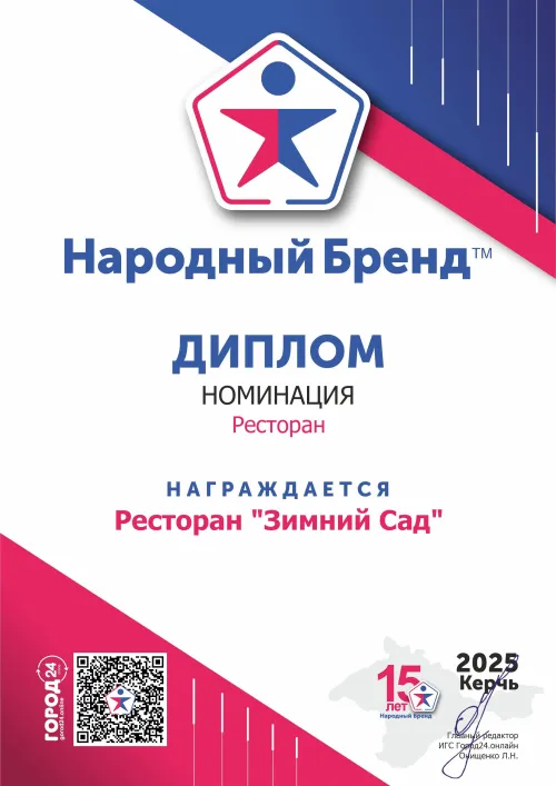 Победа в номинации «Ресторан» - это результат многолетней работы команды кафе «Зимний Сад», любви к своему делу и искреннего стремления дарить гостям комфорт, качество и радость. Жители Керчи выбирают «Зимний Сад» за душевную атмосферу, натуральную кухню и внимание к каждой детали.