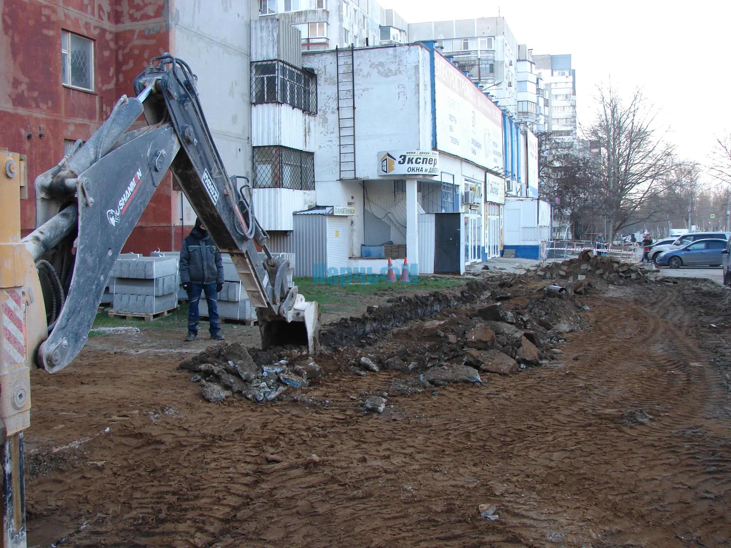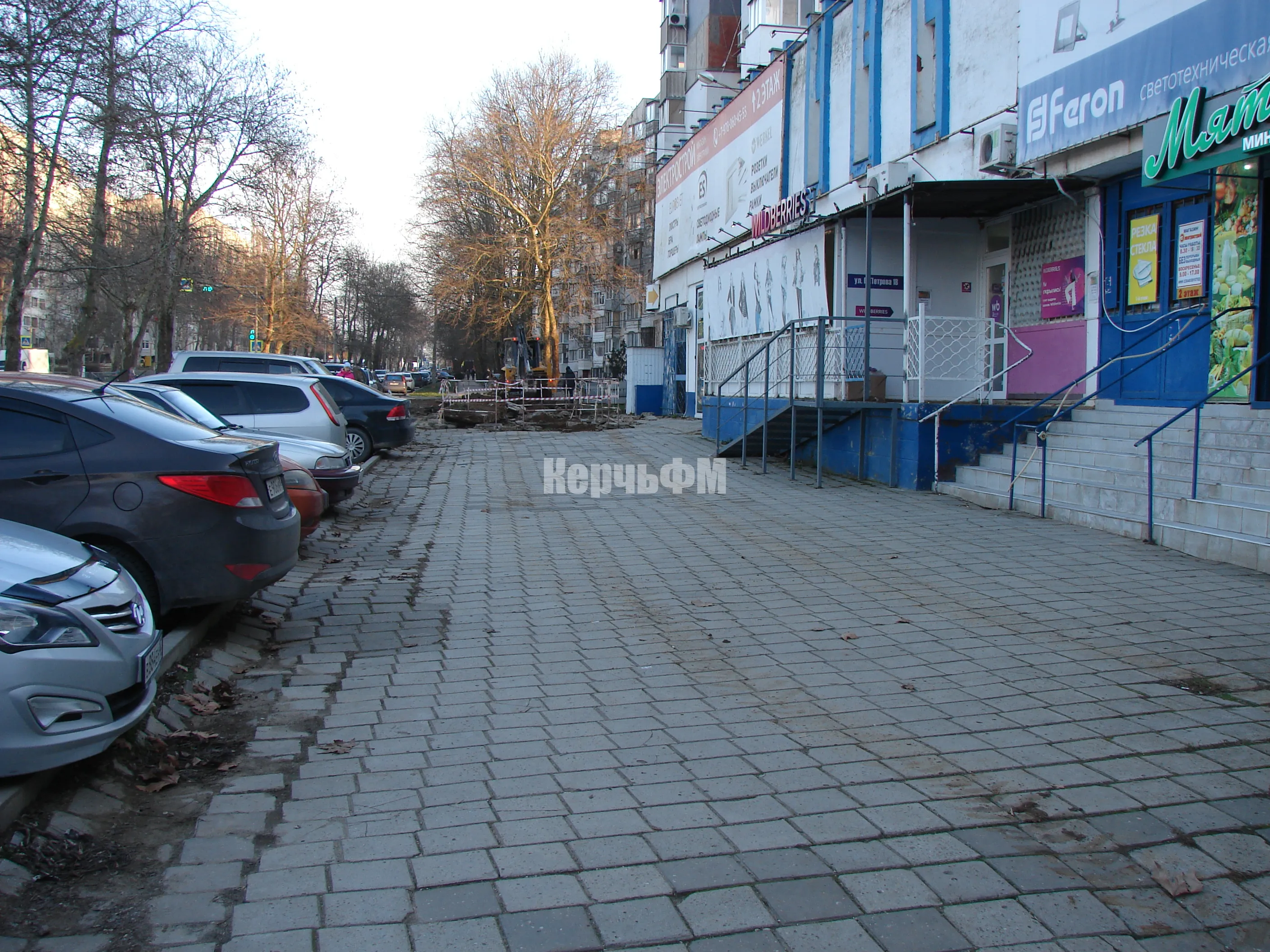 С лицевой стороны высотки по Генерала Петрова, 18 ведутся работы по частичному демонтажу тротуарной плитки.