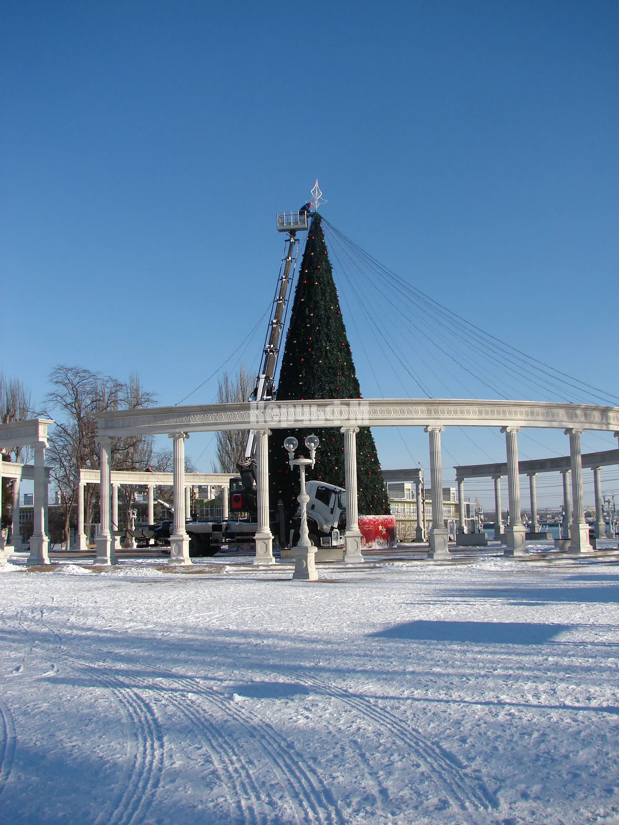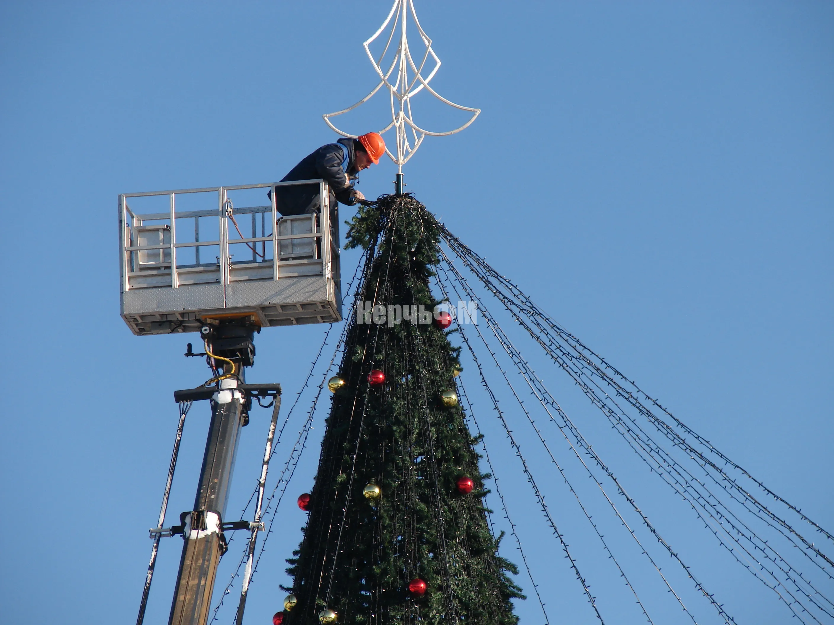 Используют две вышки, в работе пока самая высокая, так как высота елки 22 метра.