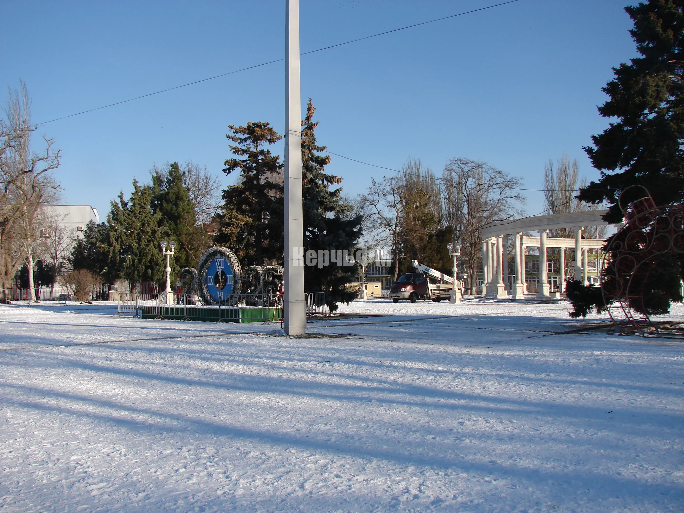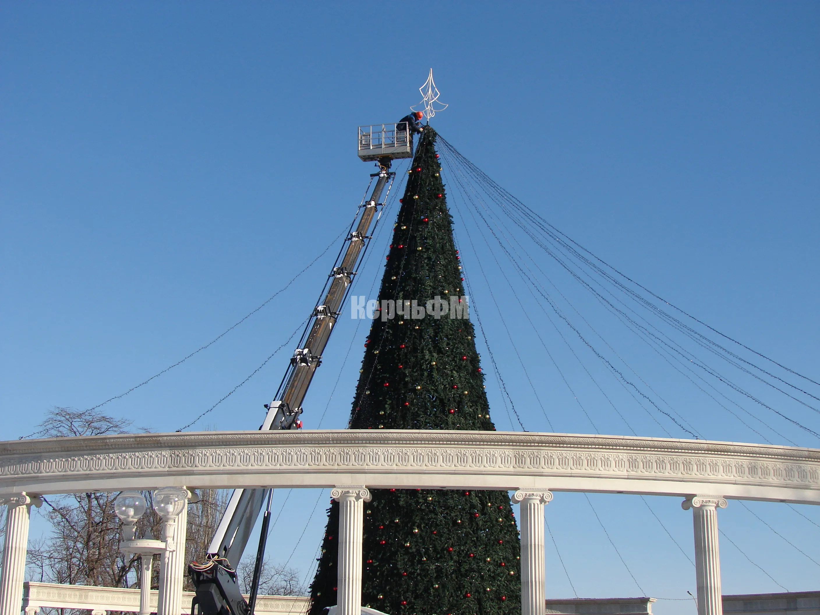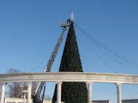 На центральной елке Керчи сегодня начали демонтировать новогоднюю атрибутику.