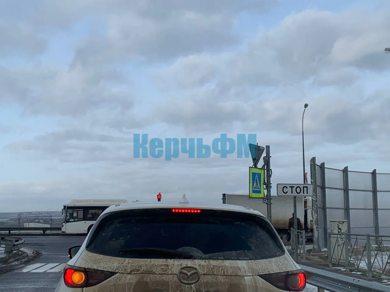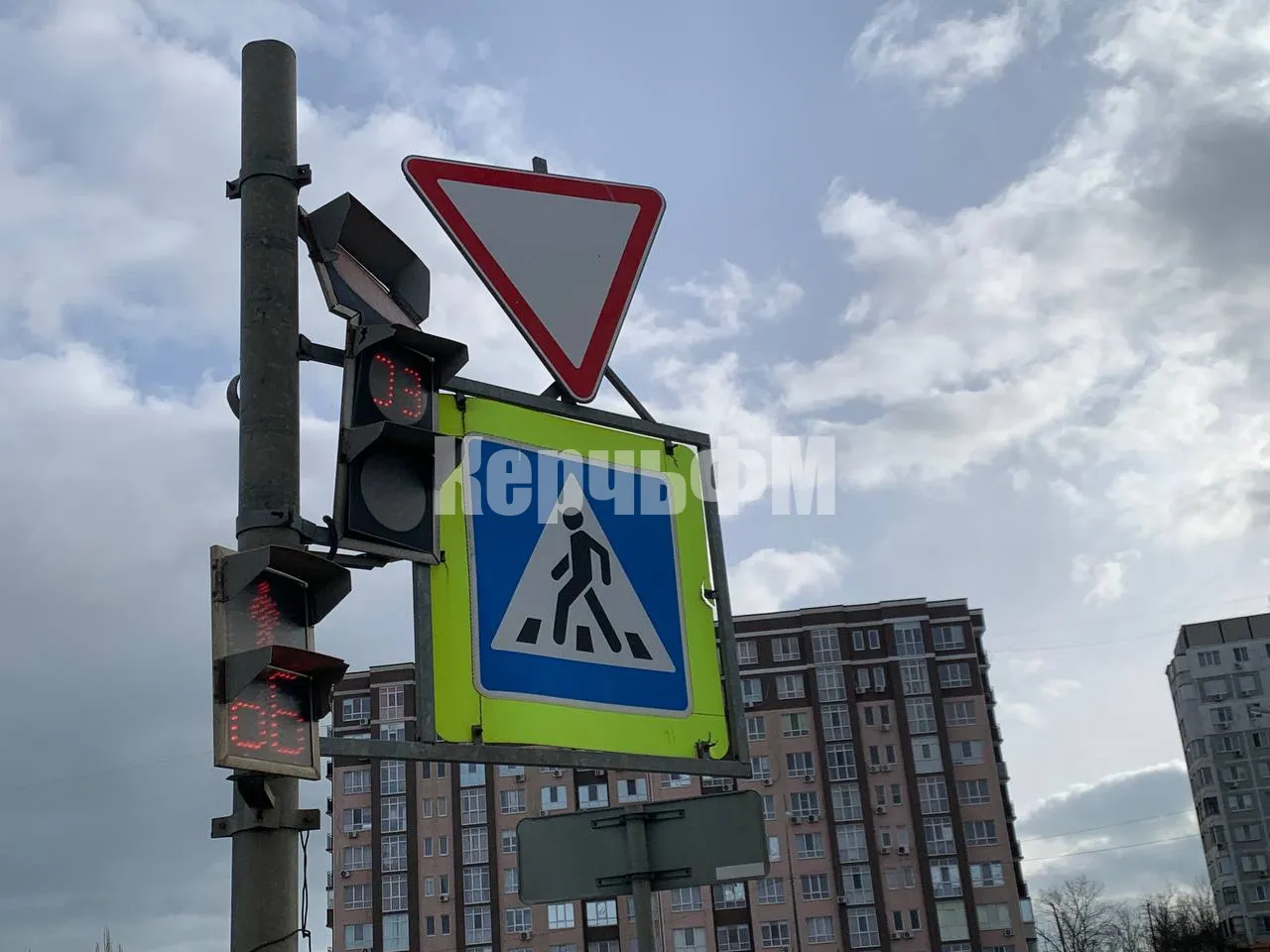 Светофор вывернуло так, что верхний красный сигнал смотрит практически в небо, передает КерчьФМ.