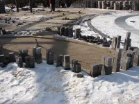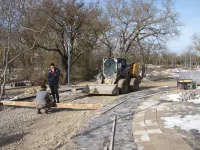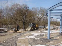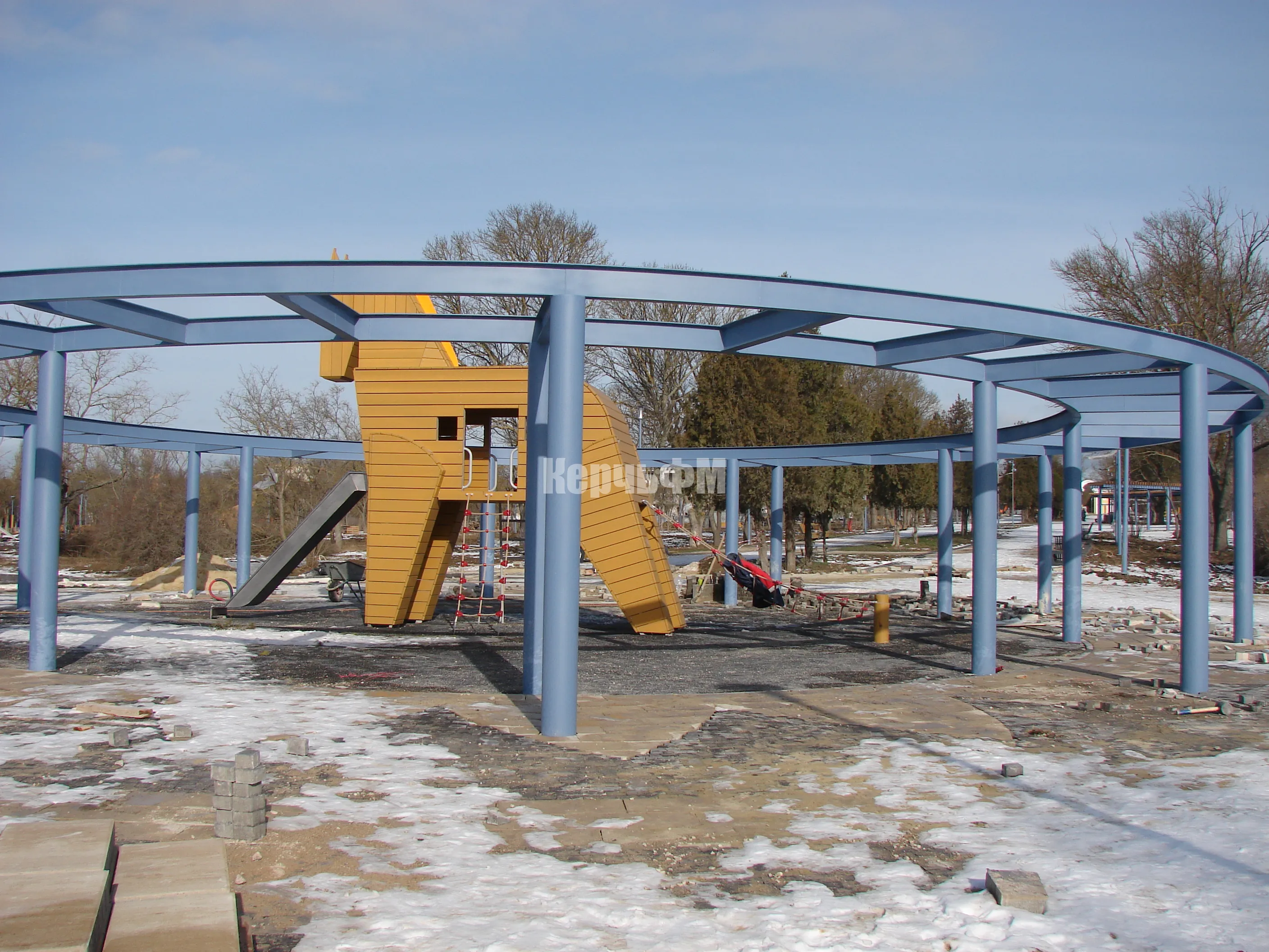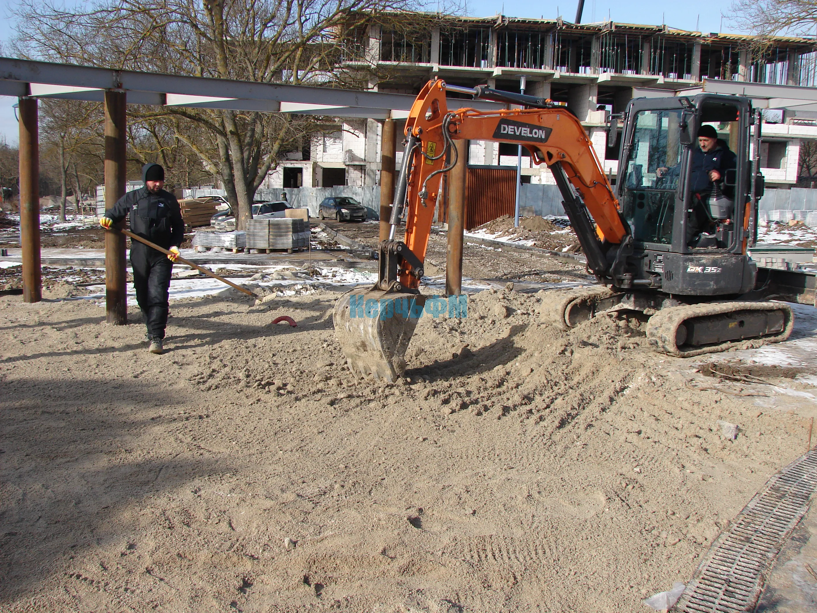 С боковых сторон, и в начале парка, и в конце центральной аллеи, работает тяжелая техника, которая помогает готовить землю под дальнейшее мощение.