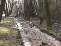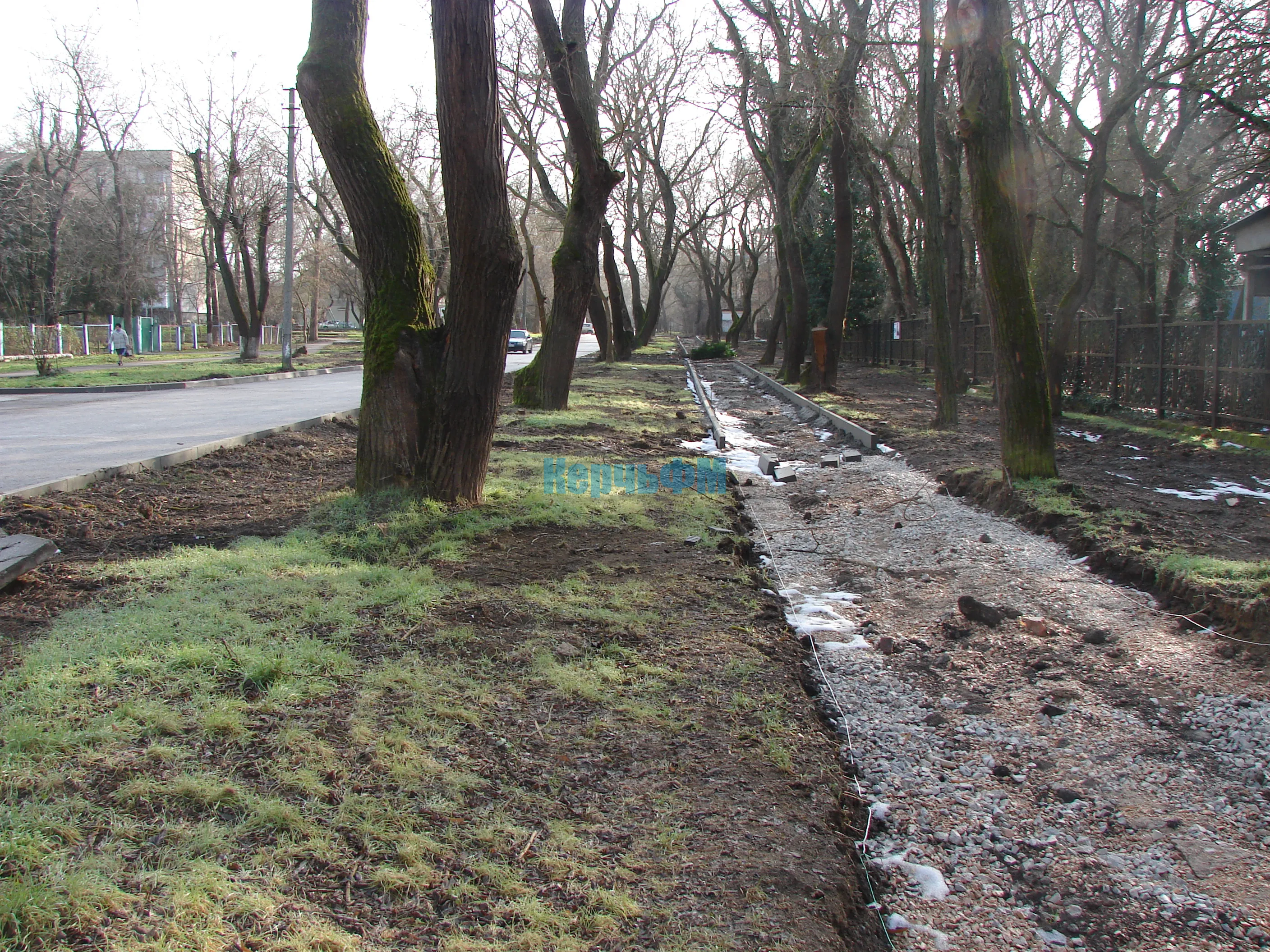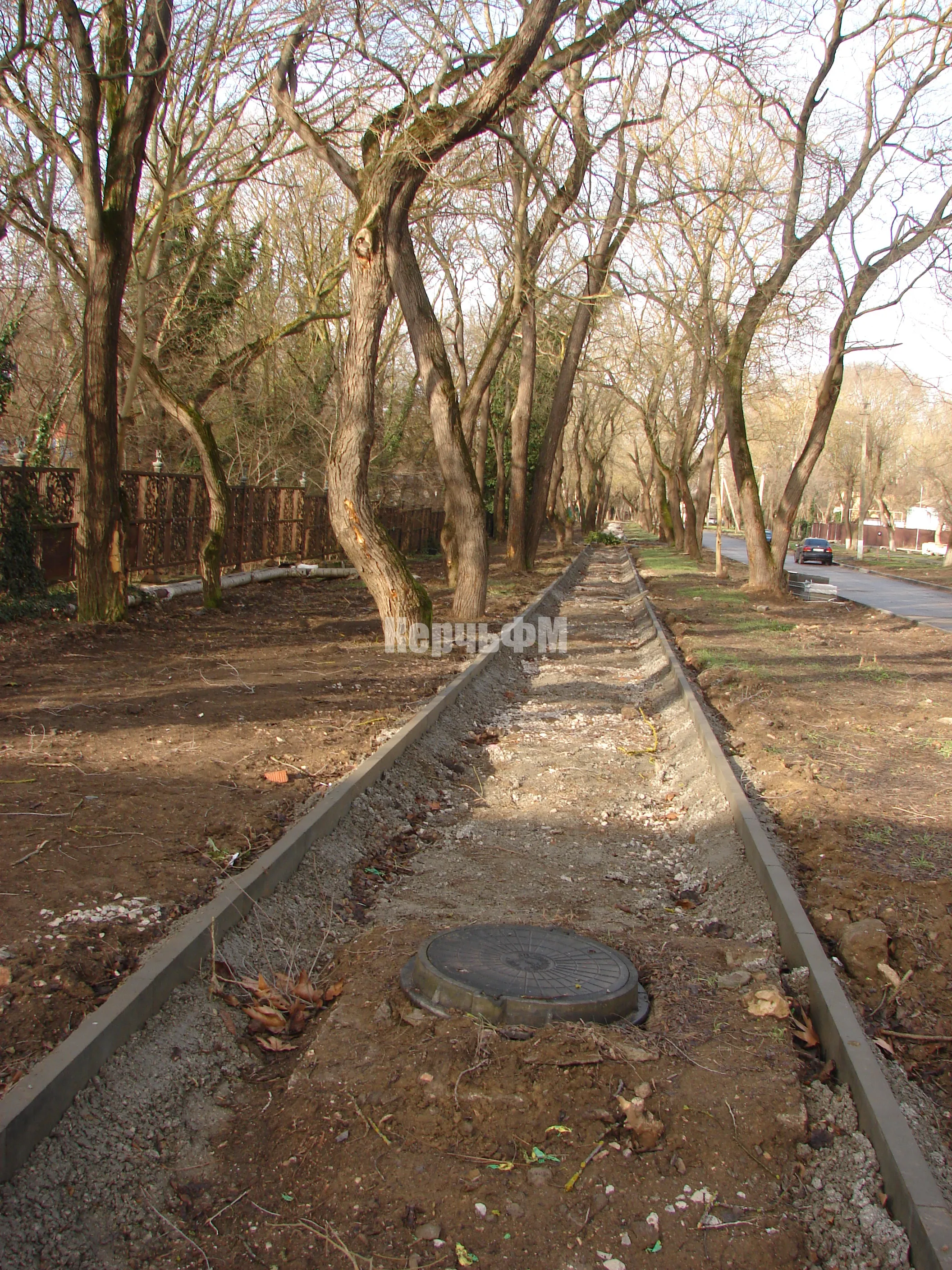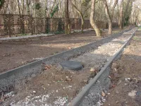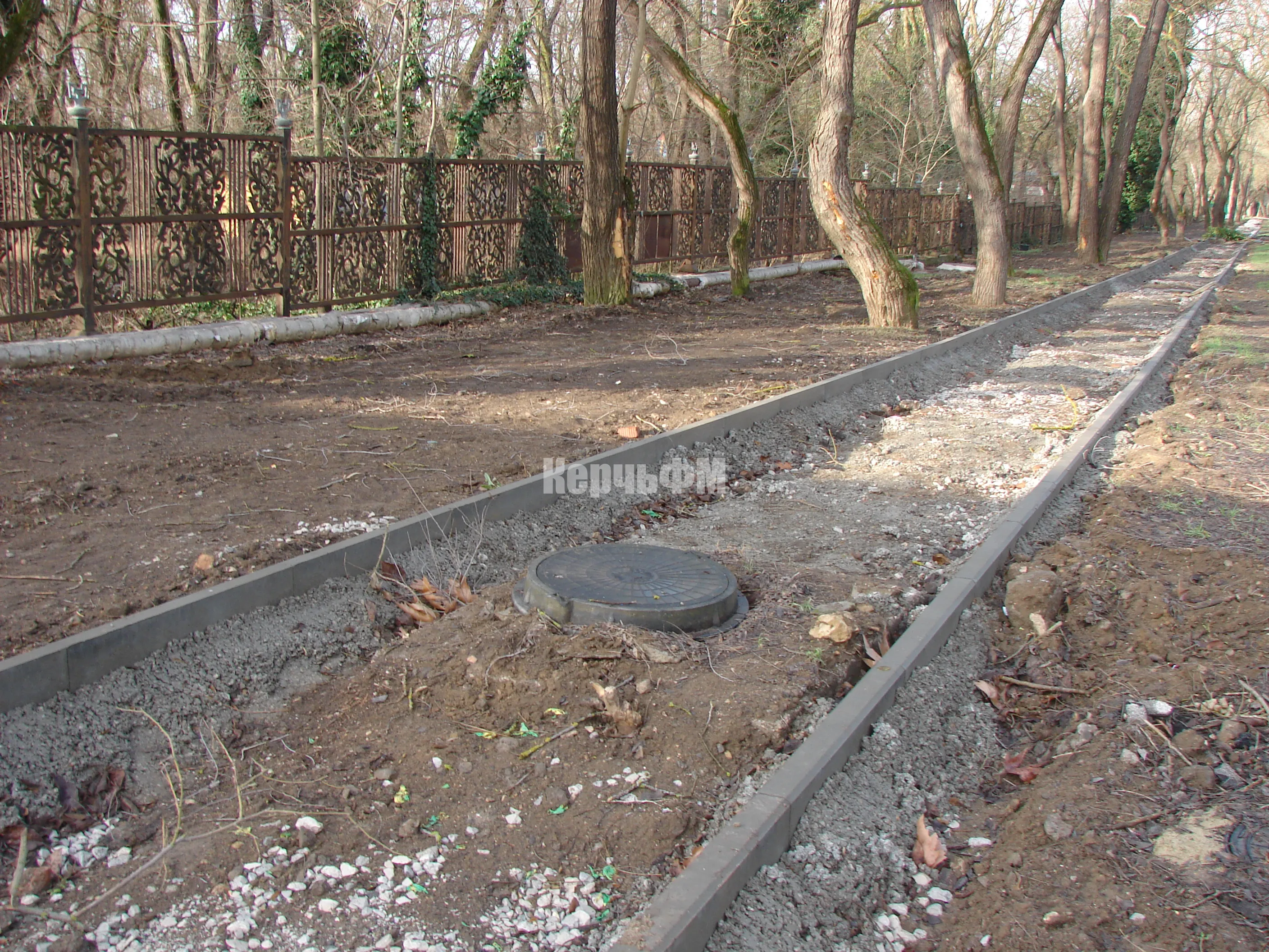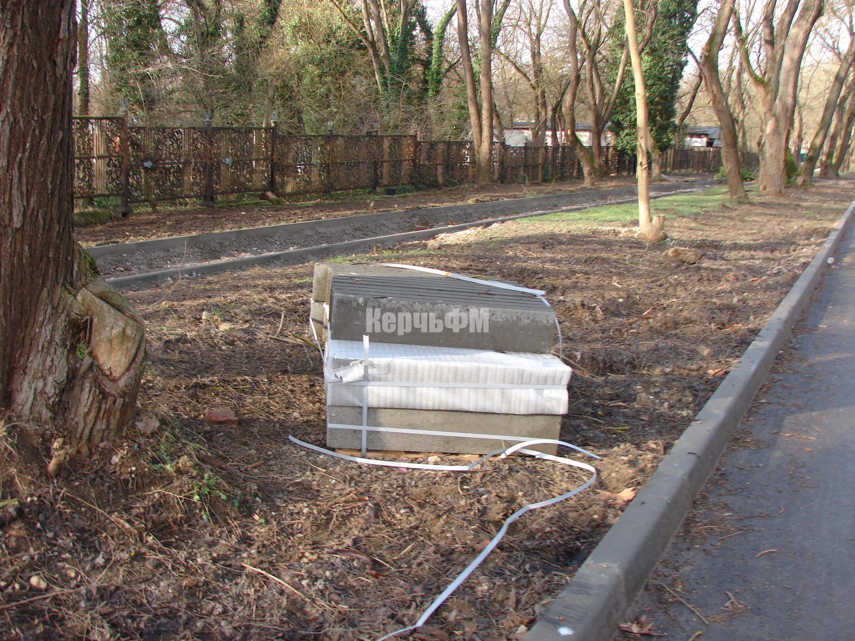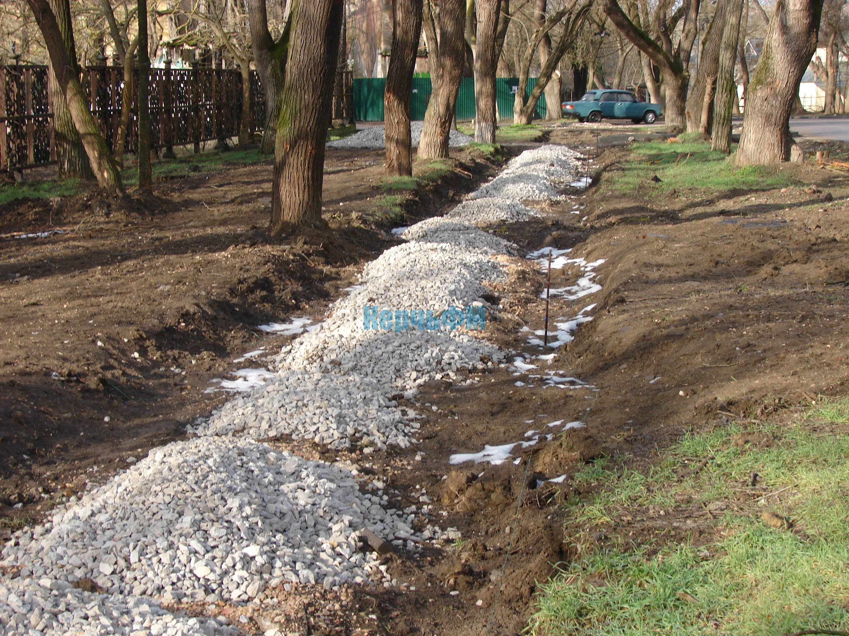 Была уложена часть бордюров, частично засыпан щебень.