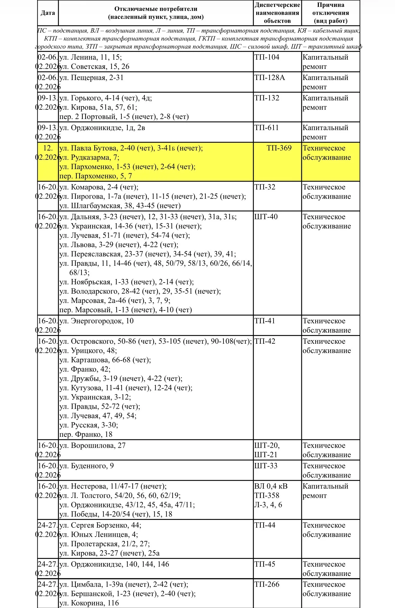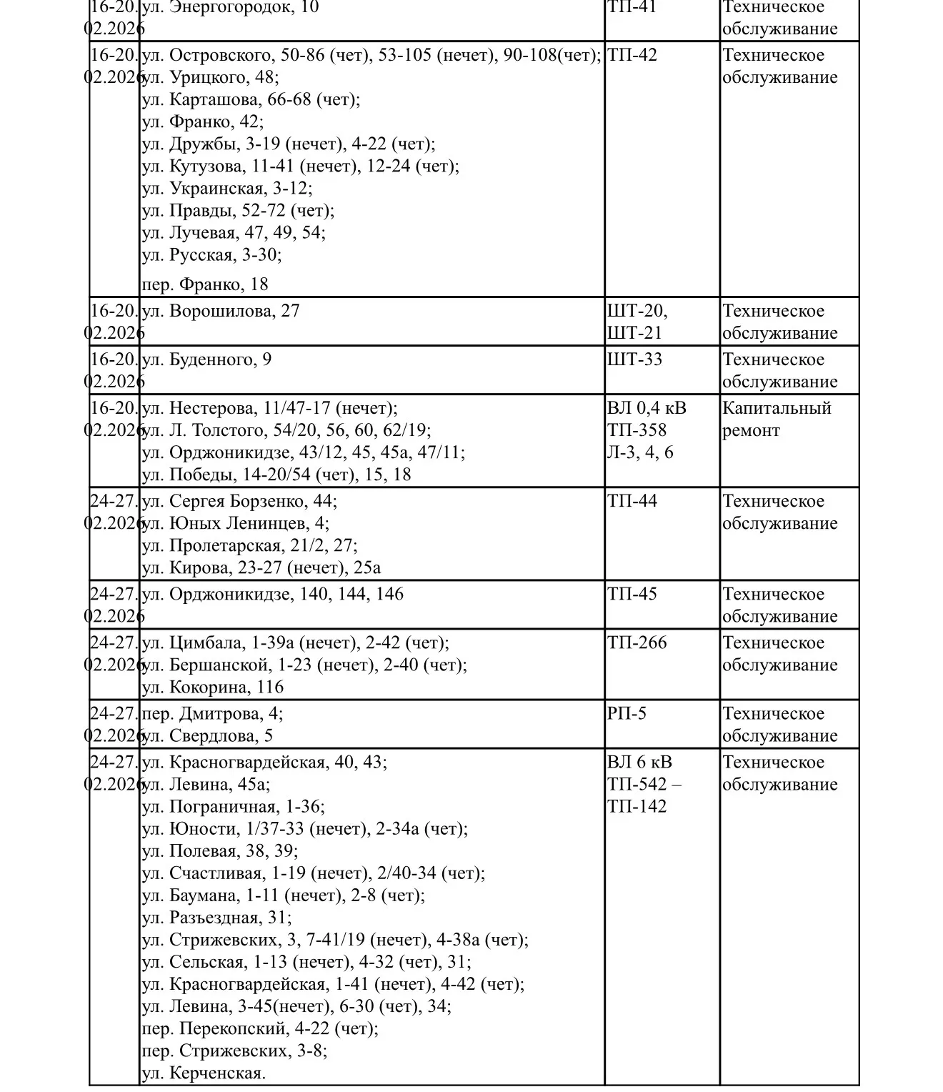 В связи с плановым ремонтом электрооборудования в феврале, в период с 8 до 17 часов, будут происходить отключения линий электропередачи согласно нижеприведенному графику. Об этом сообщает ГУП РК «Крымэнерго», - передает КерчьФМ