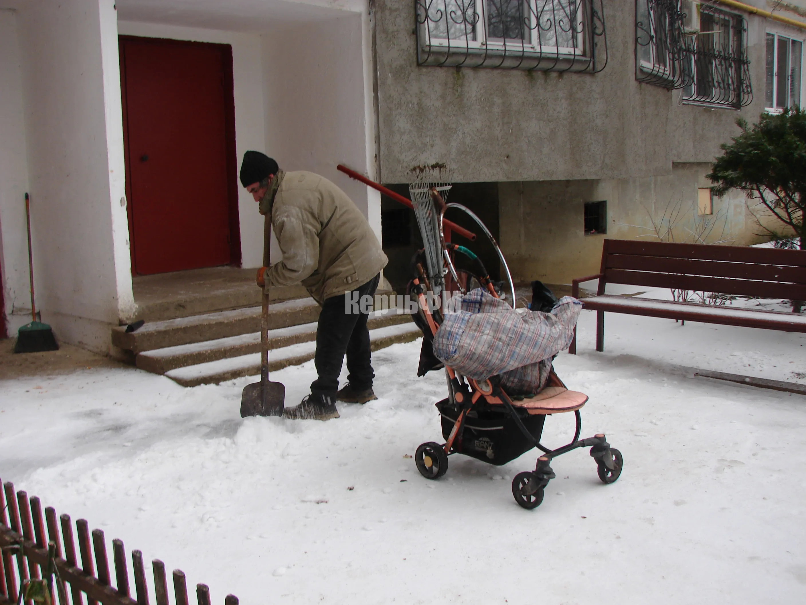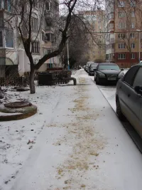 С самого утра во дворах МКД дворники в начале расчищали снег у входов в подъезды, а затем сыпали песок на тротуары и дорожки.