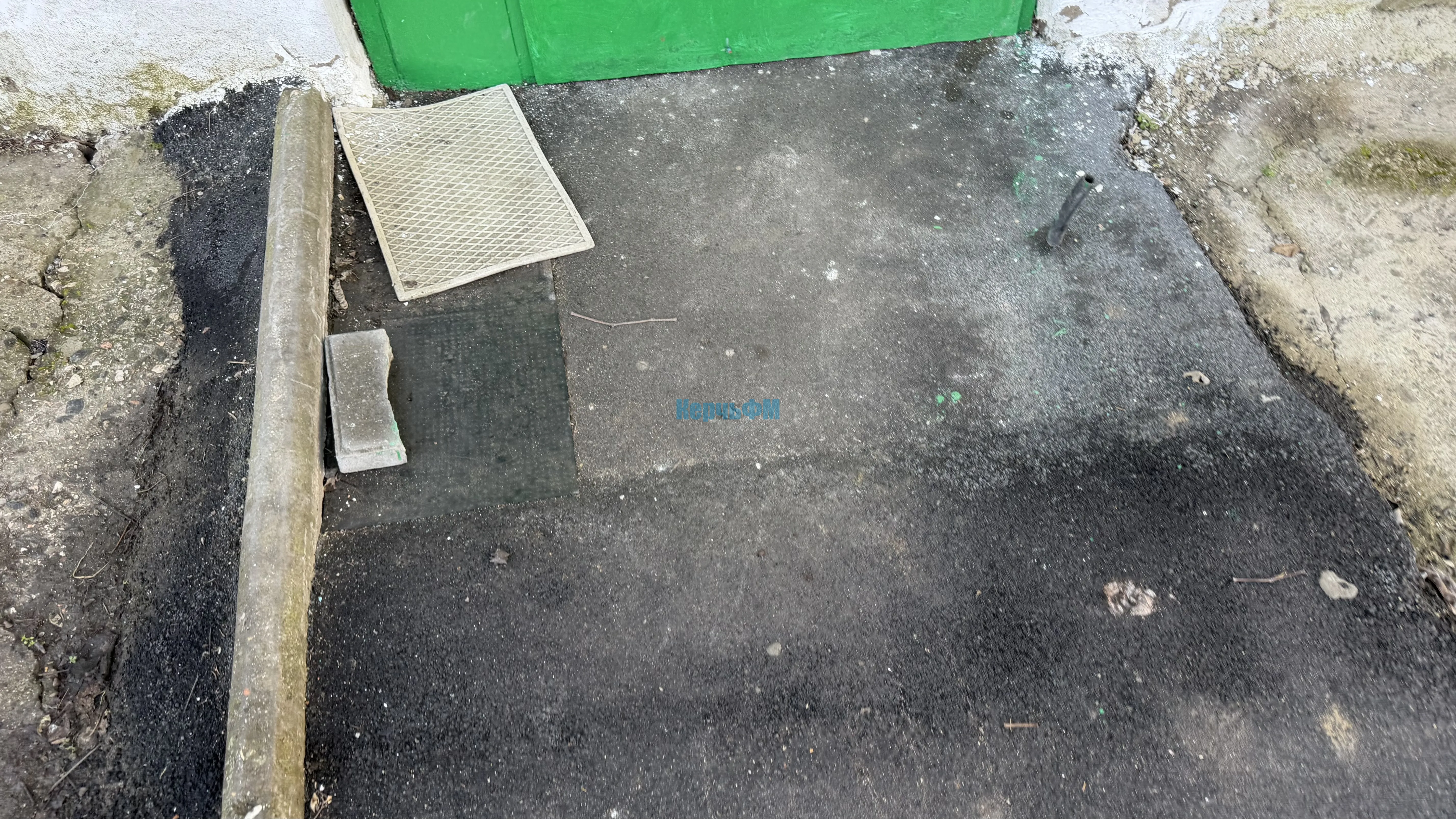 Перед входом в подъезд осталась неровность, вероятно сделанная, чтобы вода не затапливала помещение, но в тёмное время суток она превращается в опасный участок: легко споткнуться и упасть.