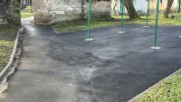 Нарекания вызывает и бельевая площадка: основания столбов залили цементом, цвет которого резко отличается от асфальта, что портит общий вид территории. Также на новом тротуаре есть непонятная «латка».