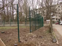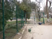 Первые ворота сделаны со стороны здания школы, а также смонтированы две калитки.