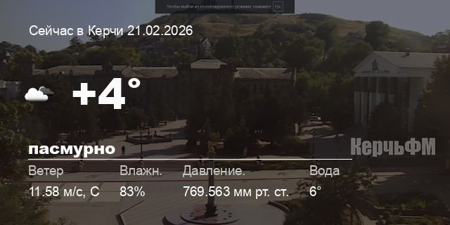 Сегодня днем в Керчи, 21 февраля, ожидается пасмурная погода, температура воздуха от +4° до +6.8°С, ветер северный 12.21 м/с, порывы до 12.88 м/с, давление 768.1 мм рт. ст., влажность 72%.