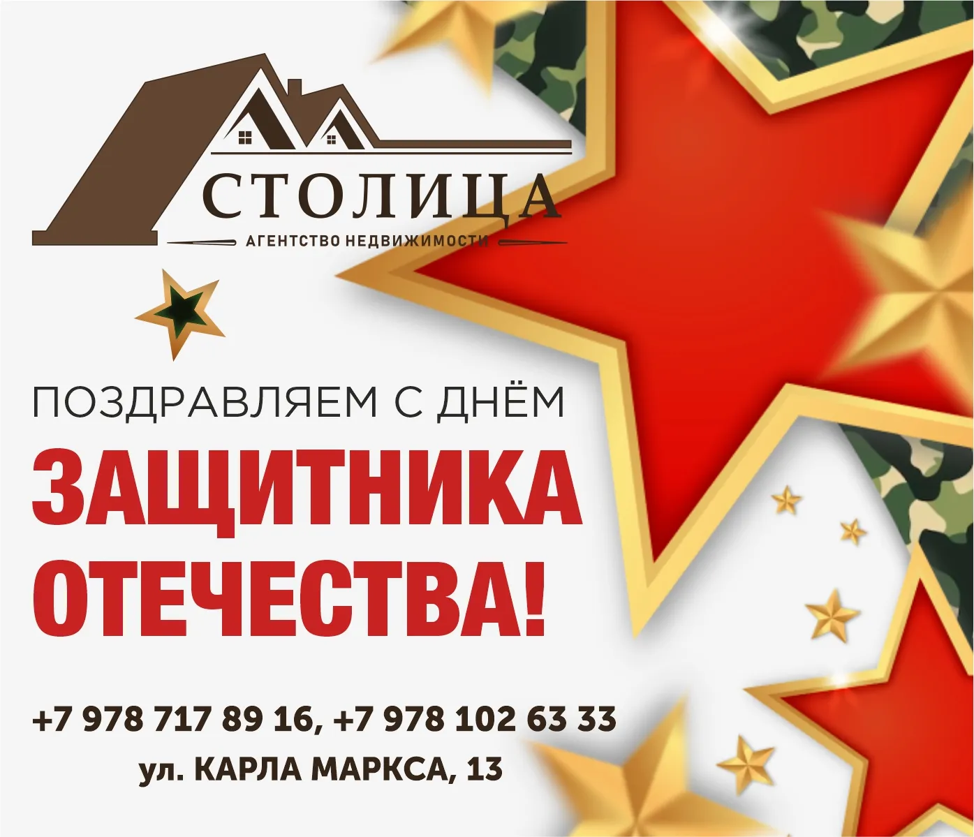 Агентство недвижимости "Столица" от всей души поздравляет вас с этим мужественным и светлым праздником - 23 Февраля!