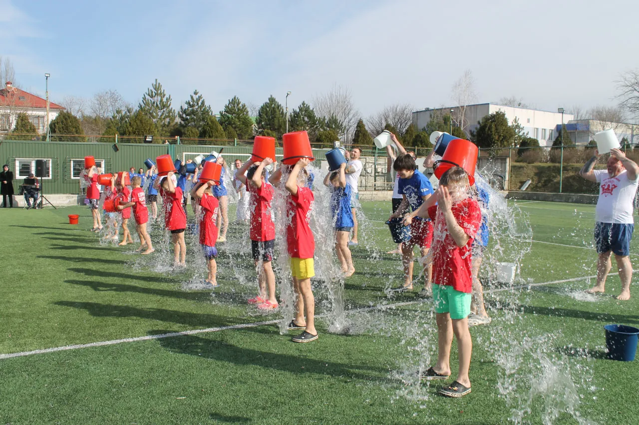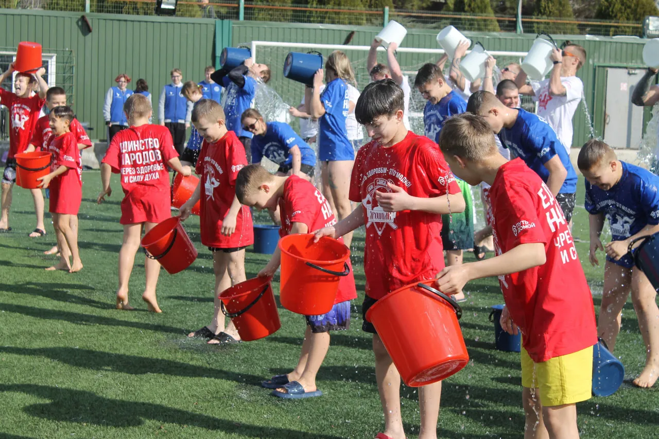 30 отважных керчан разного возраста в футболках цветов государственного флага России синхронно облились ледяной водой, продемонстрировав железную волю и отличную закалку.