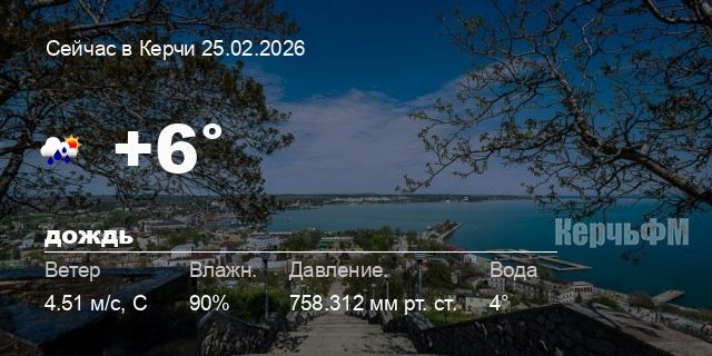 Сегодня днем в Керчи, 25 февраля, ожидается небольшой дождь, температура воздуха от +3.5° до +7.9°С, ветер северный 6.87 м/с, порывы до 9.67 м/с, давление 756.8 мм рт. ст., влажность 85%.