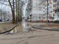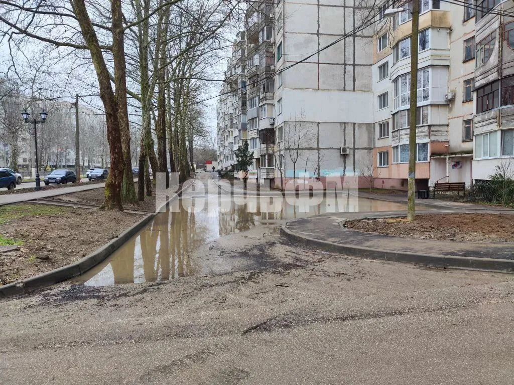 С фасадной части МКД Генерала Петрова, 20 в Керчи дожди затопили подъездную дорогу