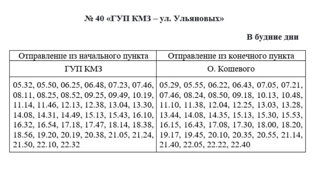 С 5 марта в тестовом режиме будет изменено расписание движения автобусов на муниципальном маршруте регулярных перевозок №40 «ГУП КМЗ - ул. Ульяновых».