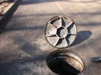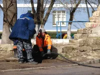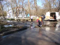 Водоканал устраняет течь из канализационного колодца в районе перекрестка Энгельса и 12 Апреля