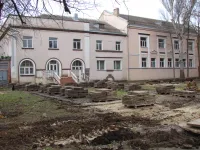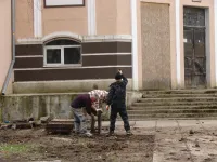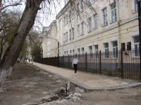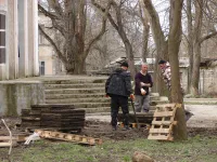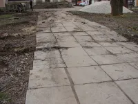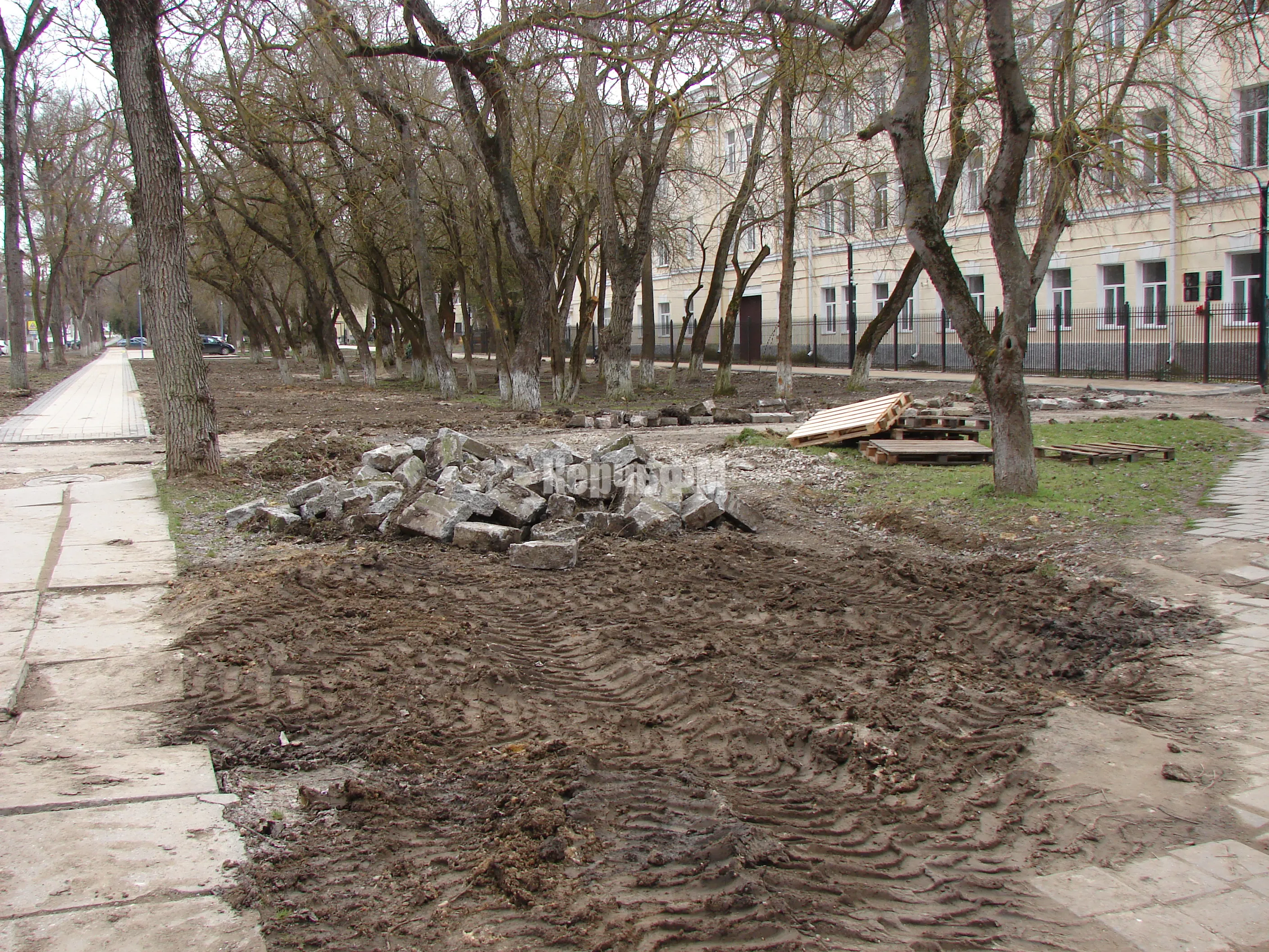 Строители демонтируют тротуарную плитку и бордюры вдоль бывшего здания Фабрики-кухни и идут дальше к корпусам техникума.