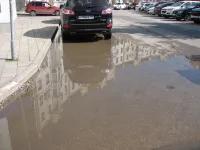 В центре города, у дома по Советской, 9, опять стоит лужа воды.