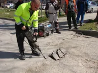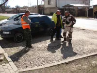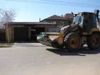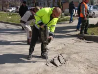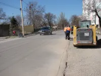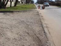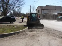 Работы выполняют пять бригад: четыре трудятся над установкой бордюрного камня вдоль нового тротуара и одна - на подготовке съездов.
