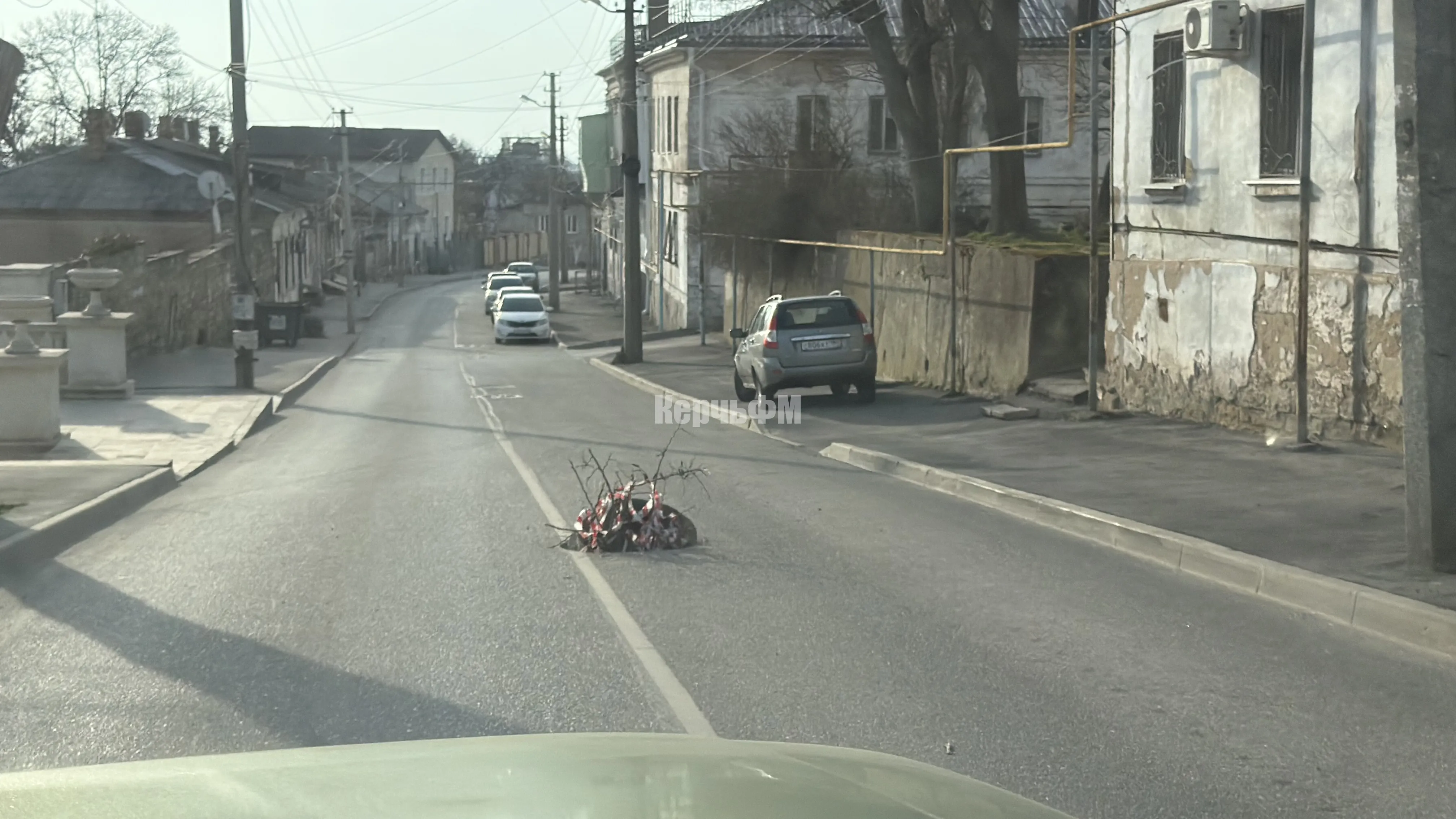 В Керчи более двух недель не могут устранить опасный открытый люк на улице 23 Мая. На данный момент он прикрыт автомобильной покрышкой, в которую вставлены ветки деревьев - импровизированное предупреждение для водителей, - передает КерчьФМ.