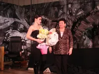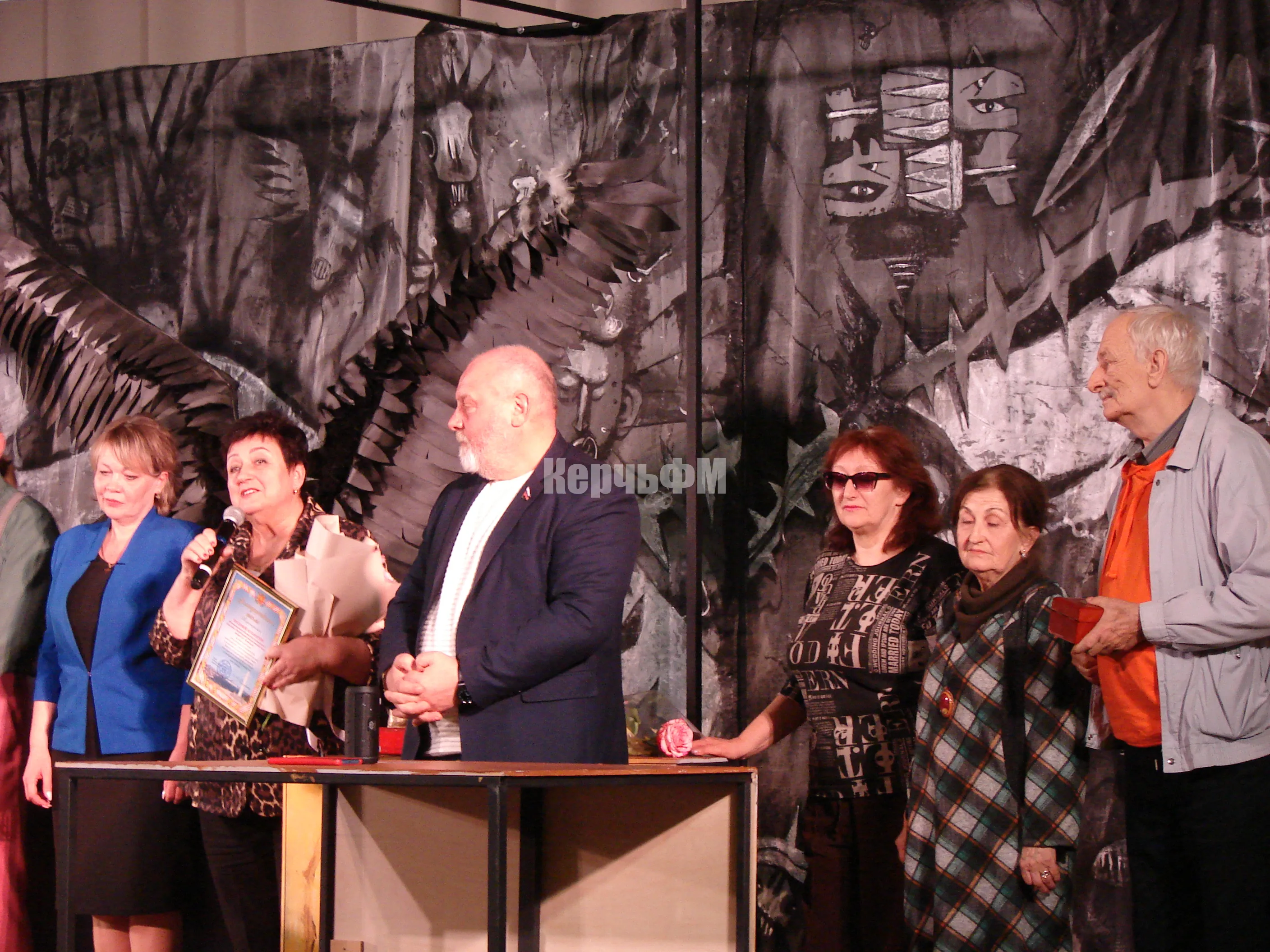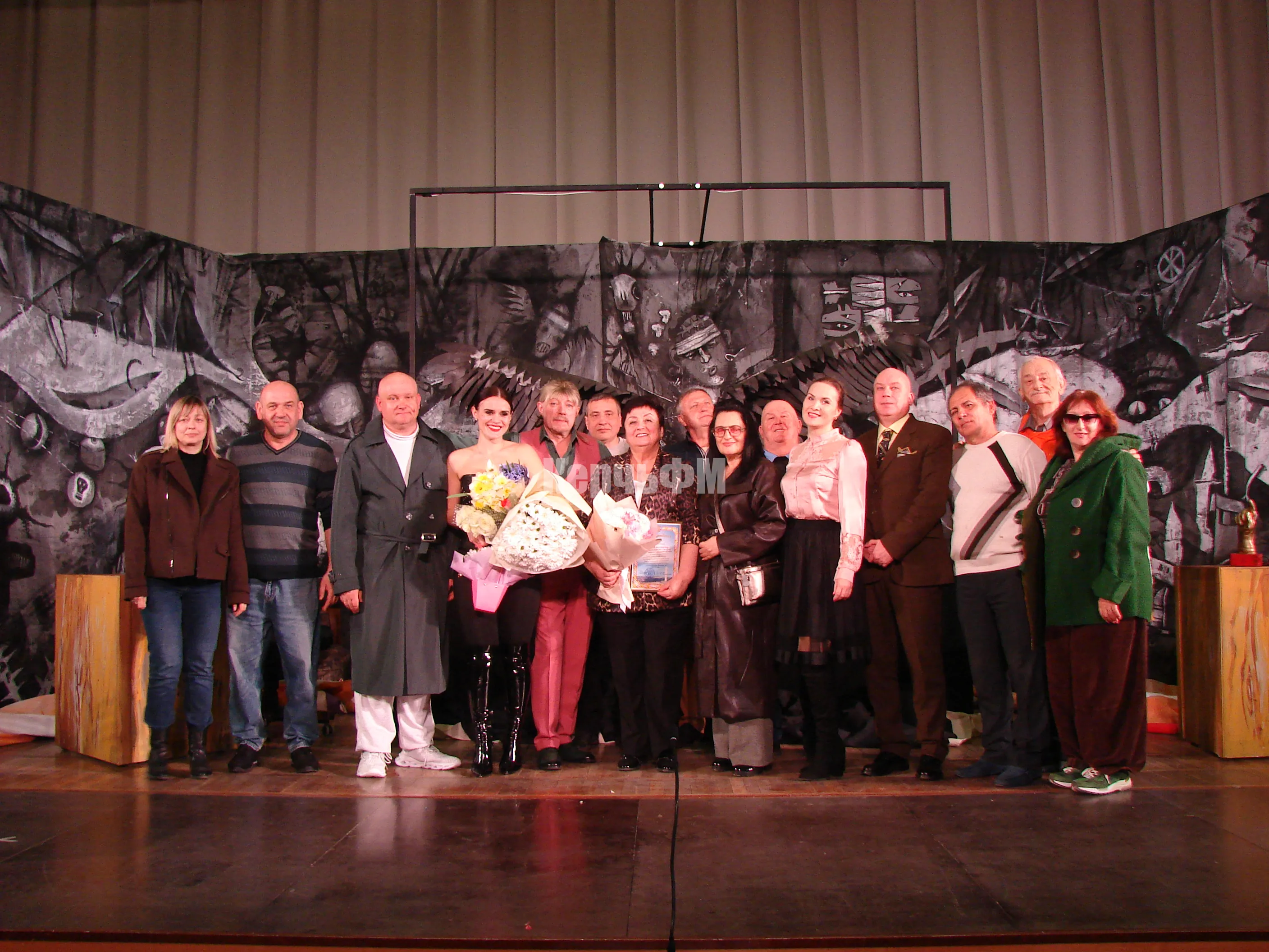 После спектакля Ольга Солодилова пригласила на сцену весь свой коллектив, включая художника, костюмера, сценических работников и поздравила их с праздником: