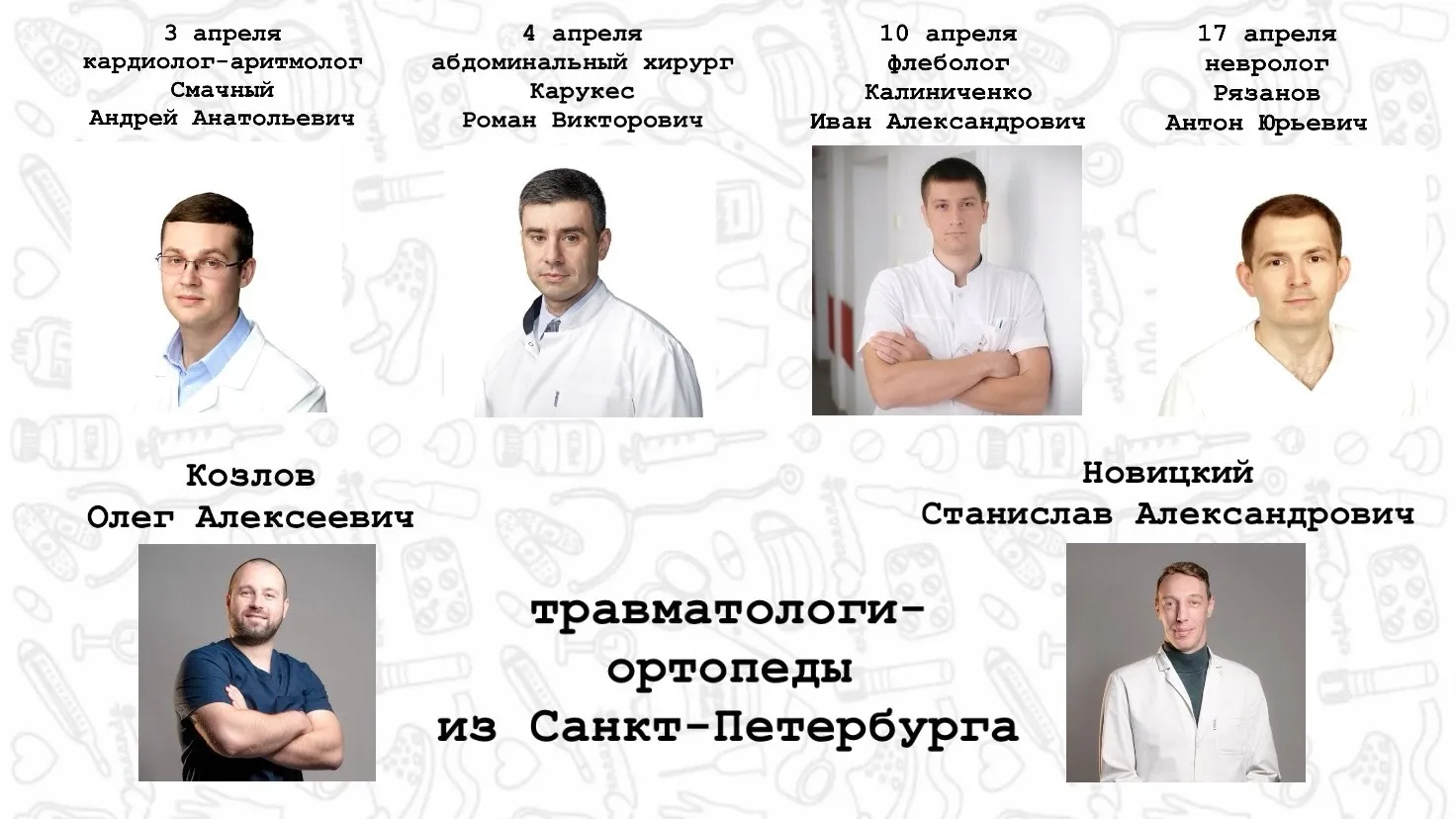 • консультация следующих специалистов: Таран В.В. (сосудистый хирург), Акульшина С.П. (гастроэнтеролог), Еремизина Л.Н.(эндокринолог), Збруев Н.Н. (кардиолог), Силкин Е.Г. (кардиолог), Фаленко С.И. (гинеколог), Олейниченко Н.Ю. (гинеколог), Коробко Т.Н. (нефролог), Голиков А.Г. (специалист узи), Ломакин  В.Г. (уролог), Нор Г.С. (специалист узи), Николаиди О.В. (специалист узи), Гирина Л.Г. (специалист узи).