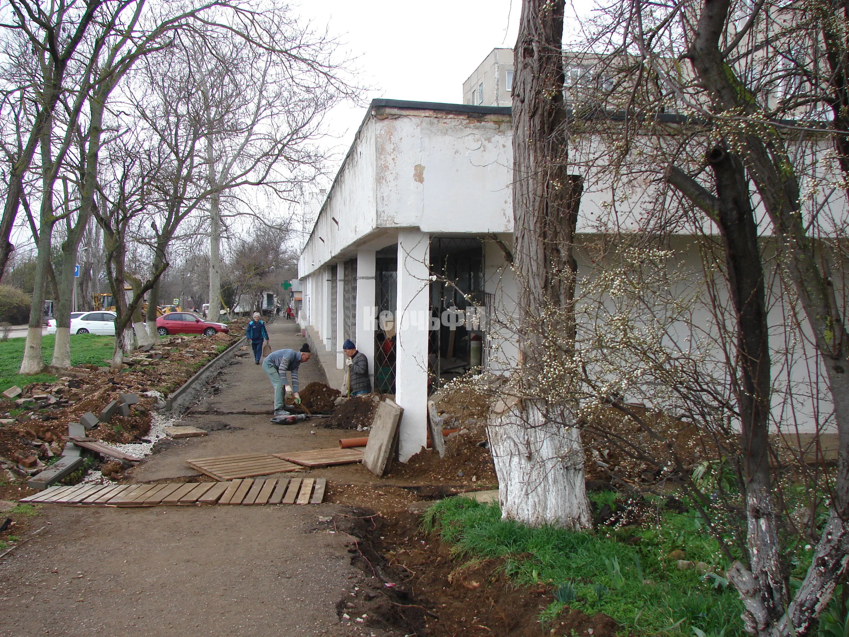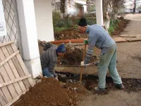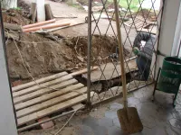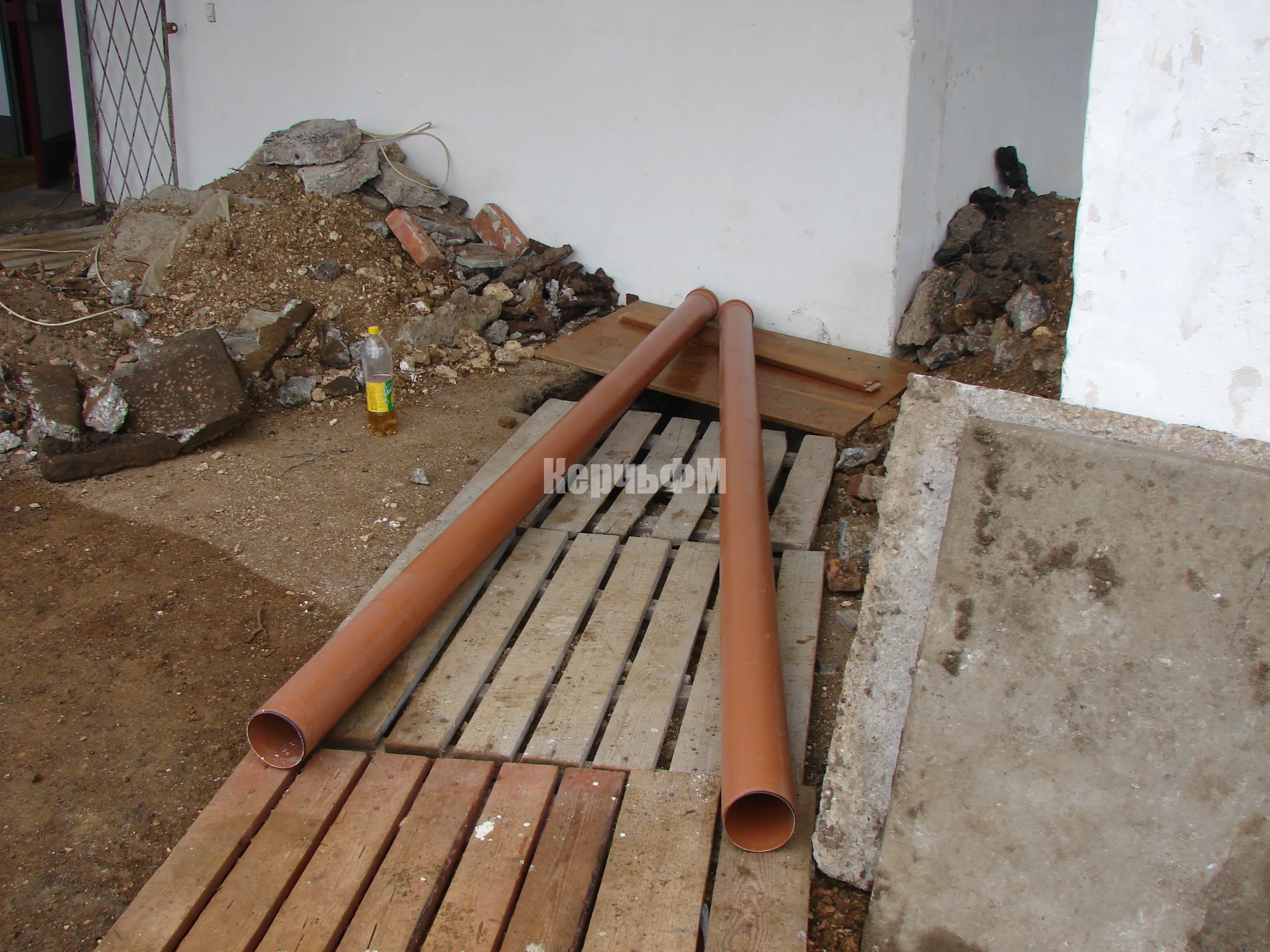 Сегодня внимание строительной бригады сосредоточено на замене труб водоотведения у входа в здание библиотеки.