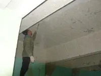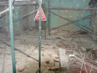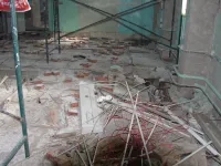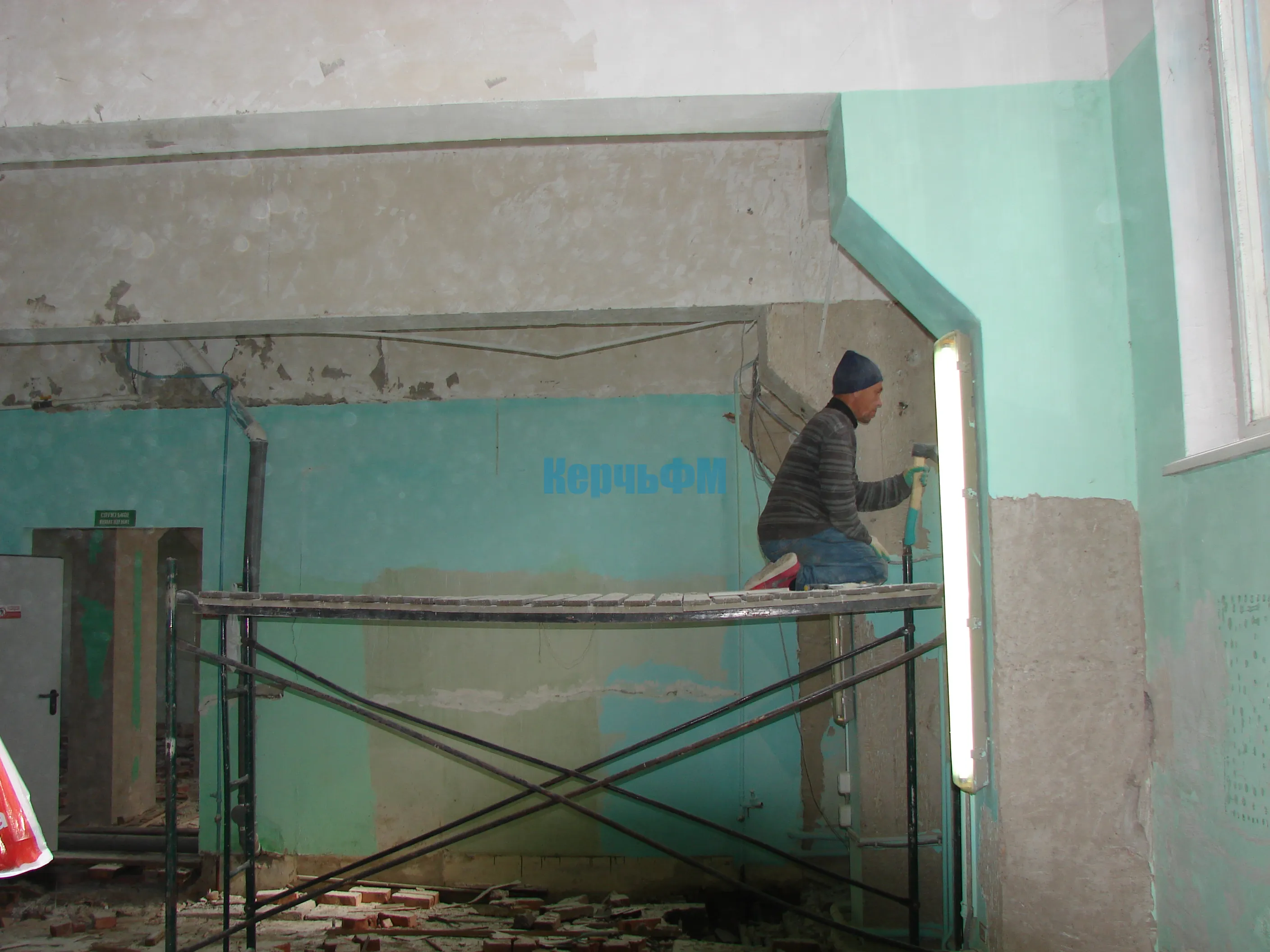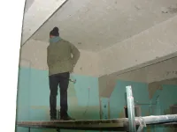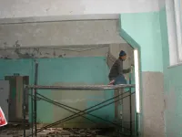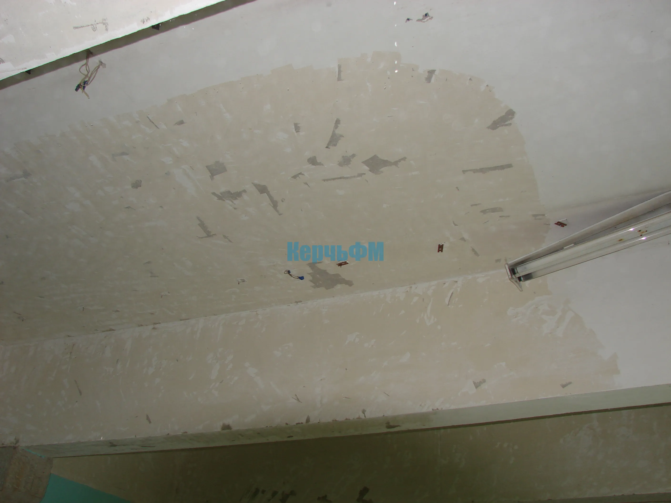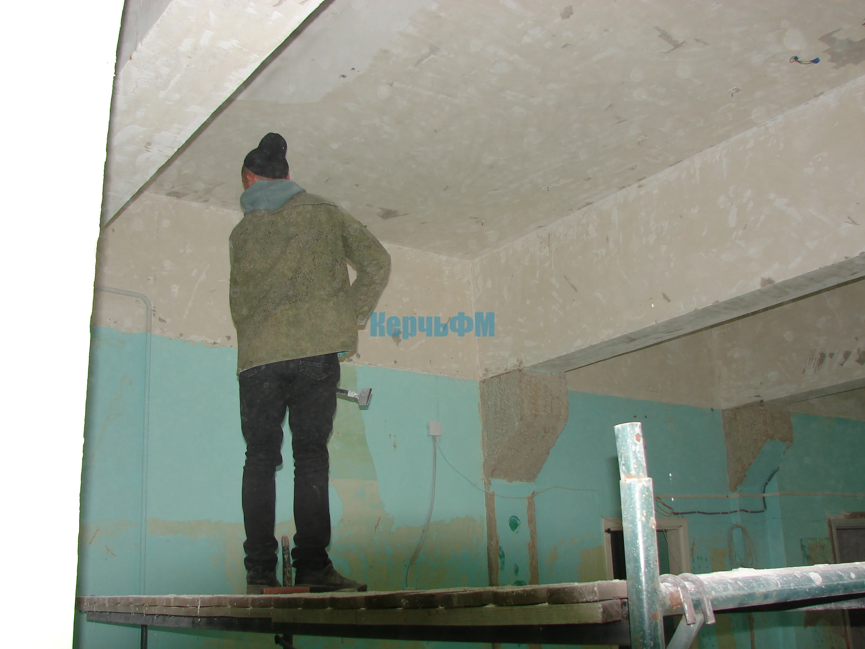 Строители сегодня заняты подготовкой потолков в правом крыле здания: удаляют старую побелку, зачищают швы.