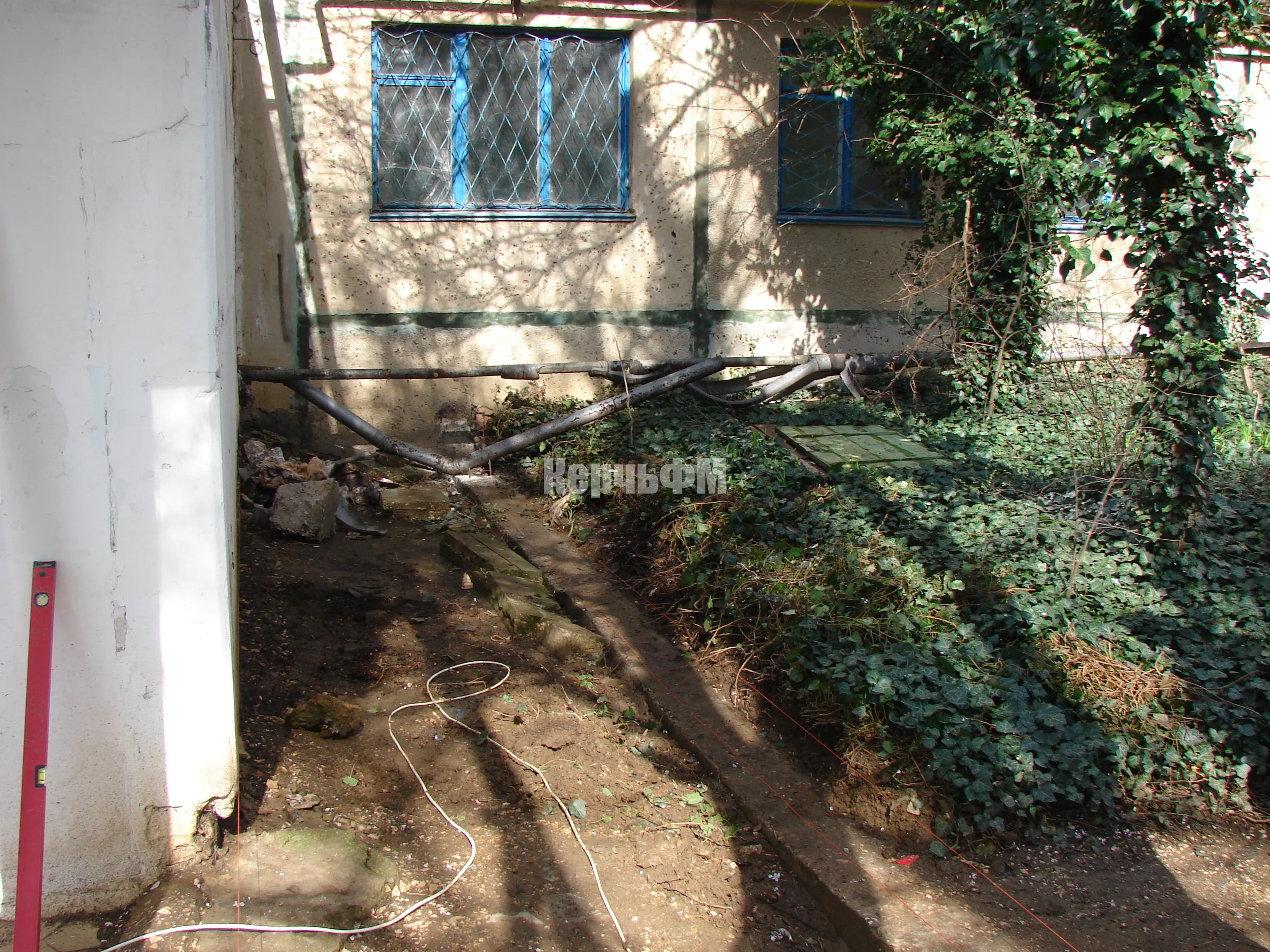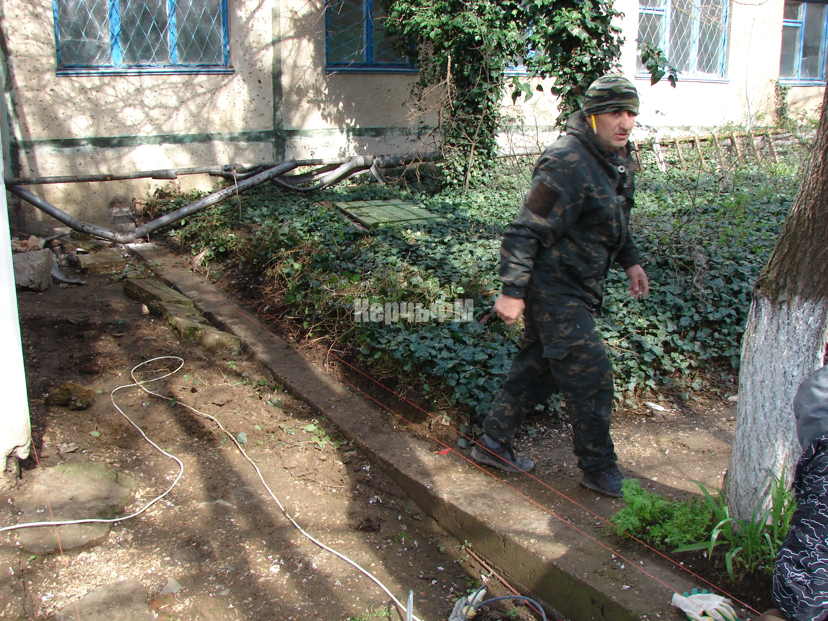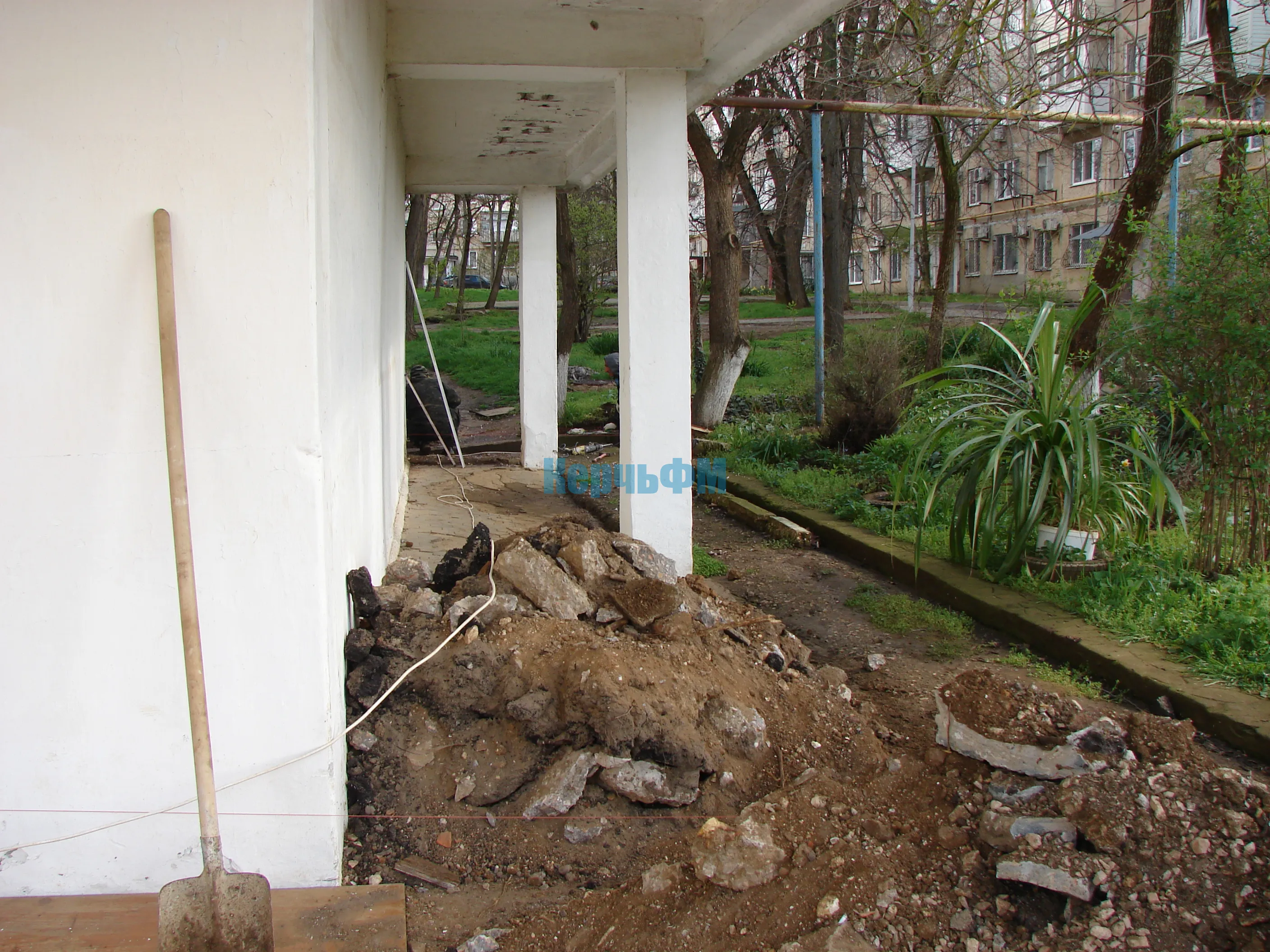 Другие рабочие готовятся к обустройству новых отмостков с правой и задней части библиотеки.