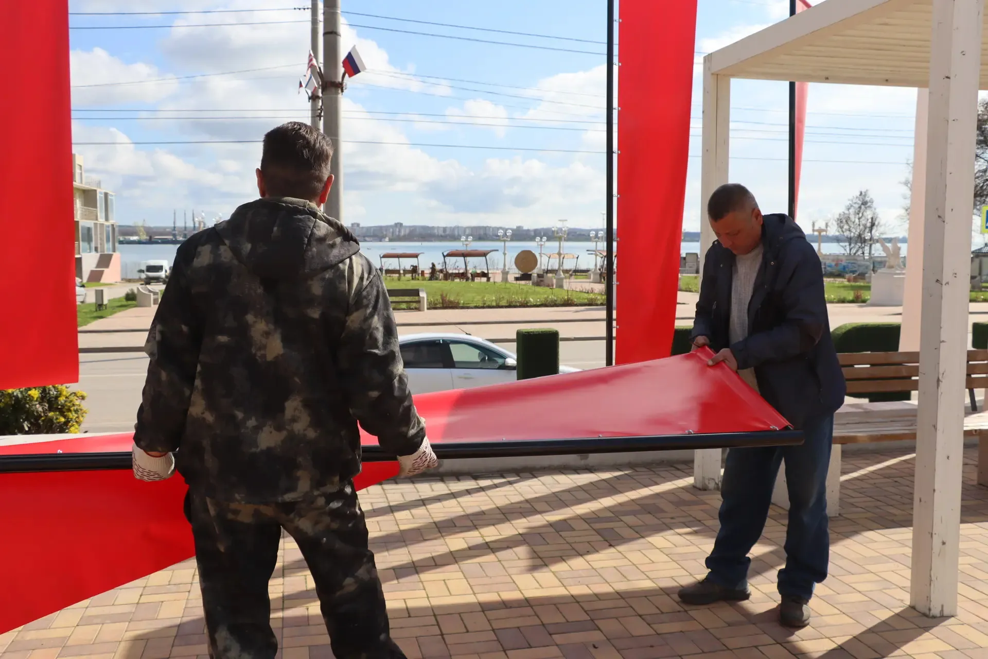Инсталляцию «Город‑герой Керчь» оформили красно‑белыми полотнами