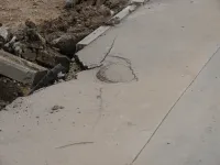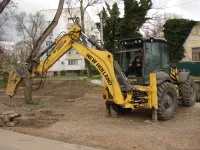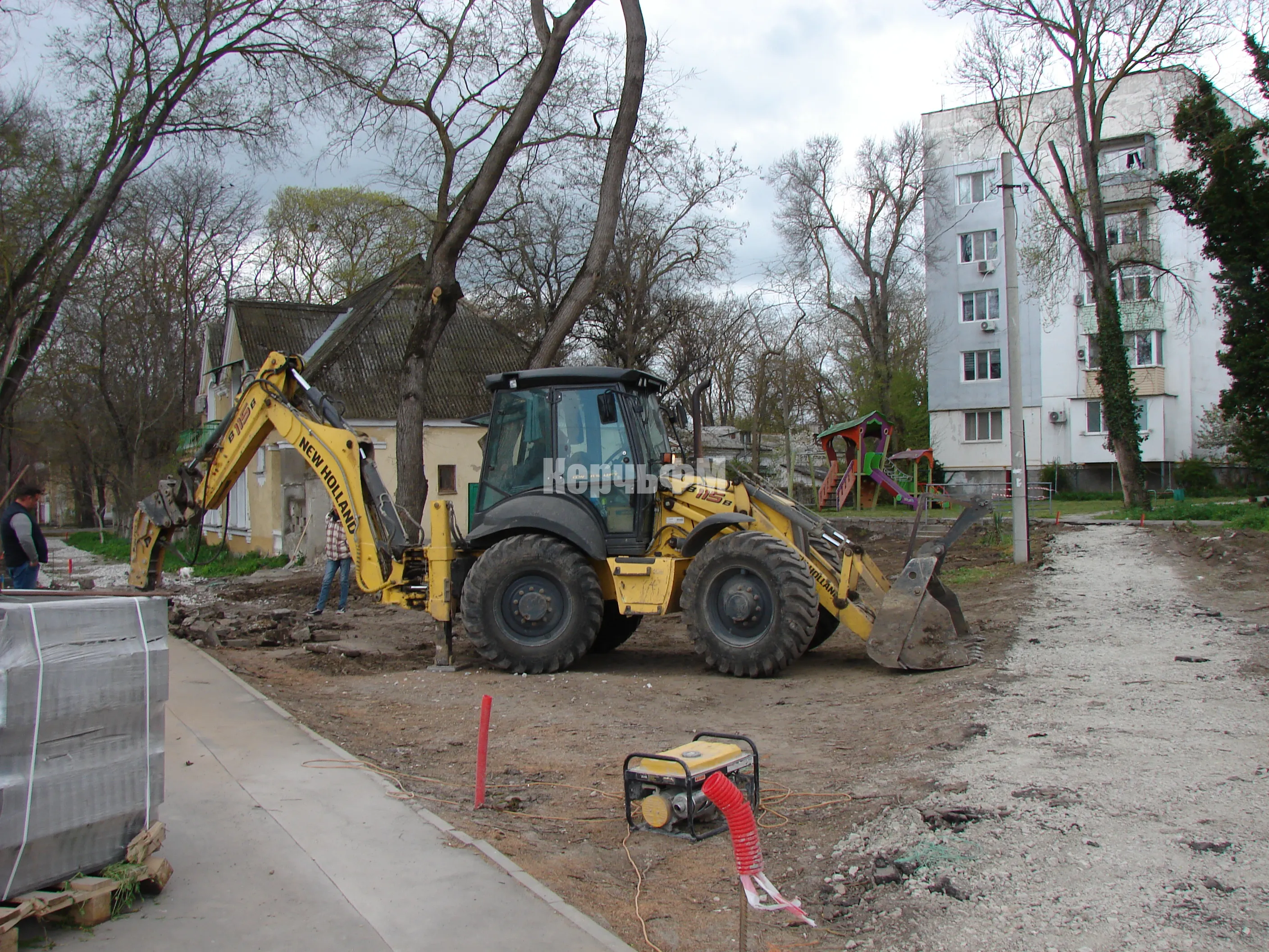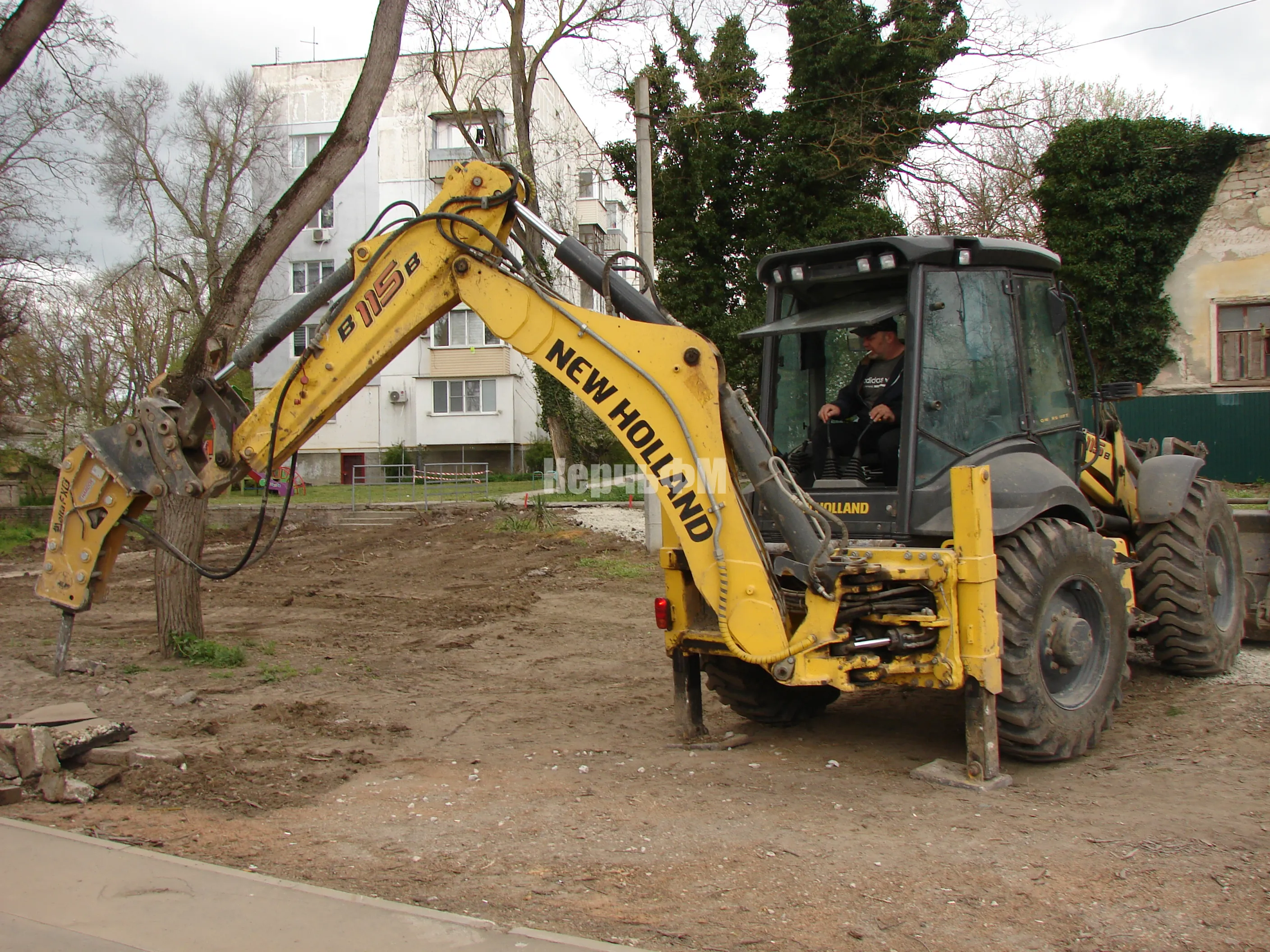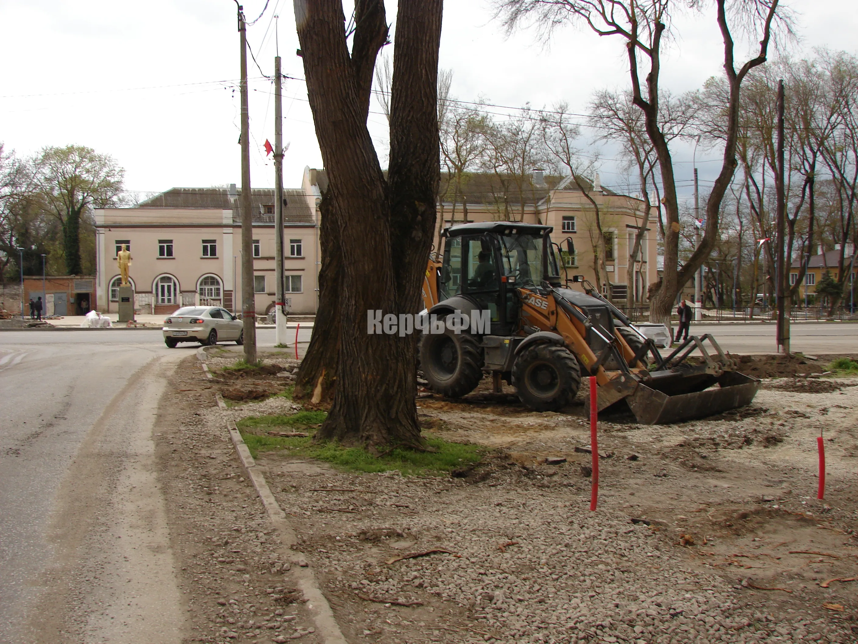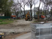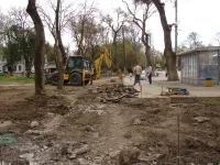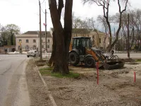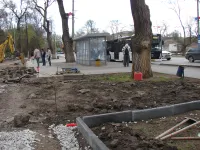 Тяжелая техника демонтирует старые бордюры и вывозит строительный мусор.