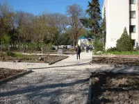 Намеченные и обнесенные бордюрами новые тротуарные дорожки, расширенная аллея вдоль Школы, которая ведет от супермаркета к остановке "Казакова", и сама площадь перед зданием, остаются без плитки.