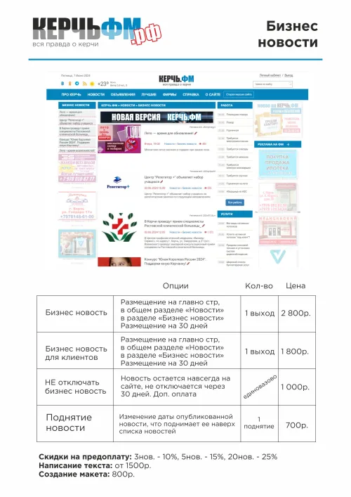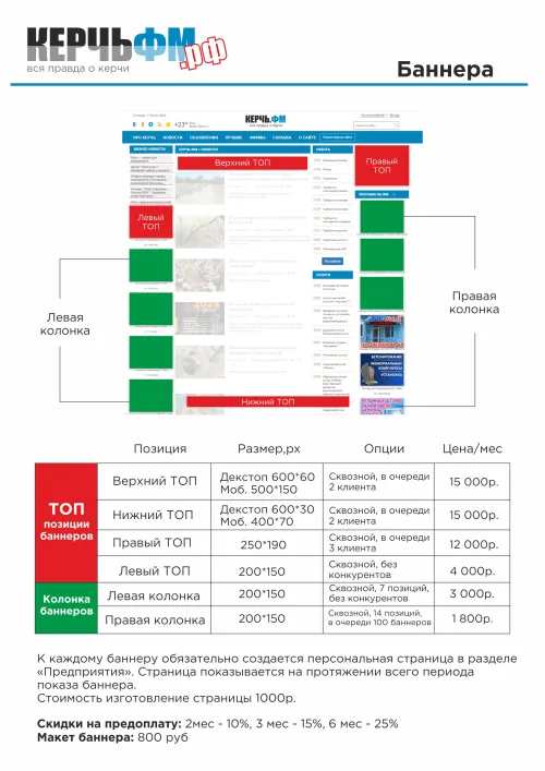 Перечень рекламных мест, которые вы можете арендовать на сайте Керчь.ФМ