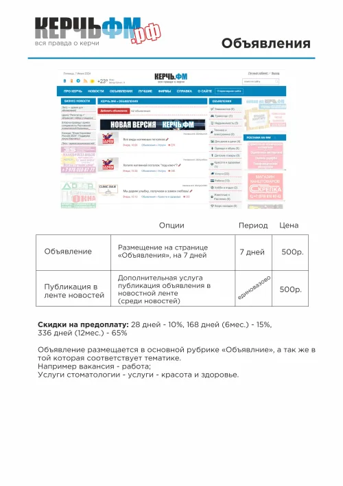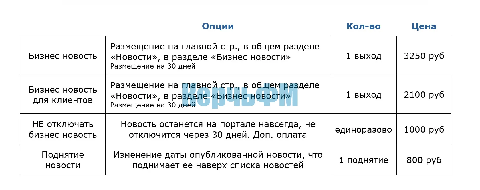 Сайт КерчьФМ предлагает платное размещение вашей информации в лентах новостей на Главной странице с пометкой "Реклама".